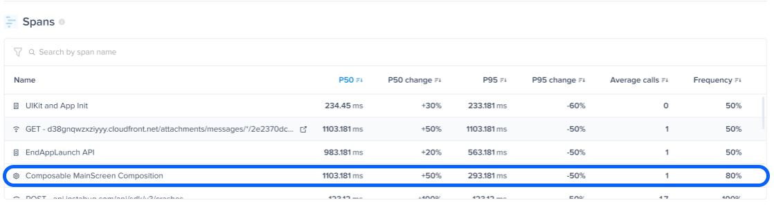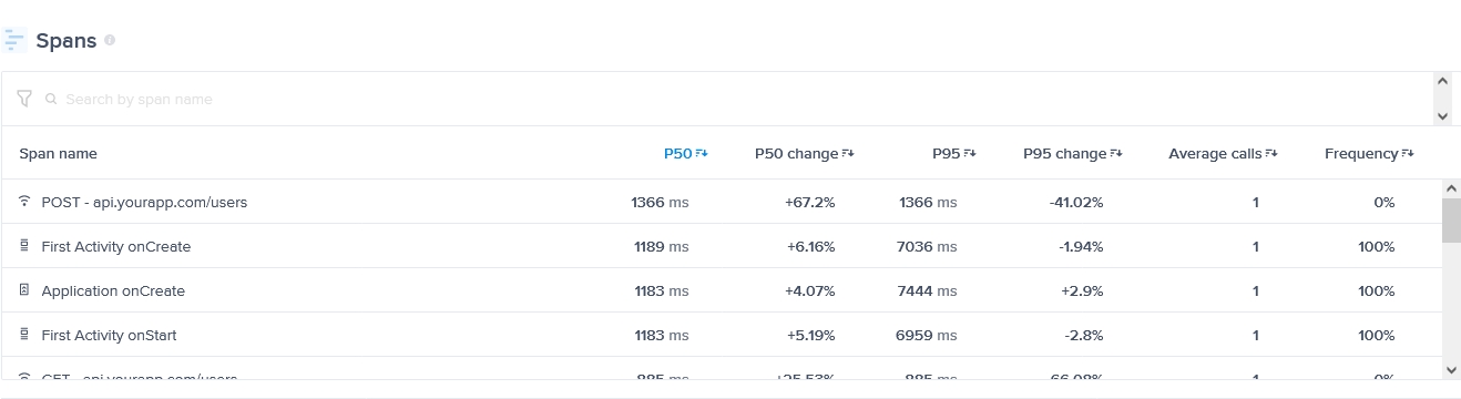Spans allow you to understand better the root causes of the latencies that occur during your app’s launch and screen loading. This section provides a detailed breakdown of the duration of the platform life cycle stages, network calls, and more information during the app launch and screen loading.