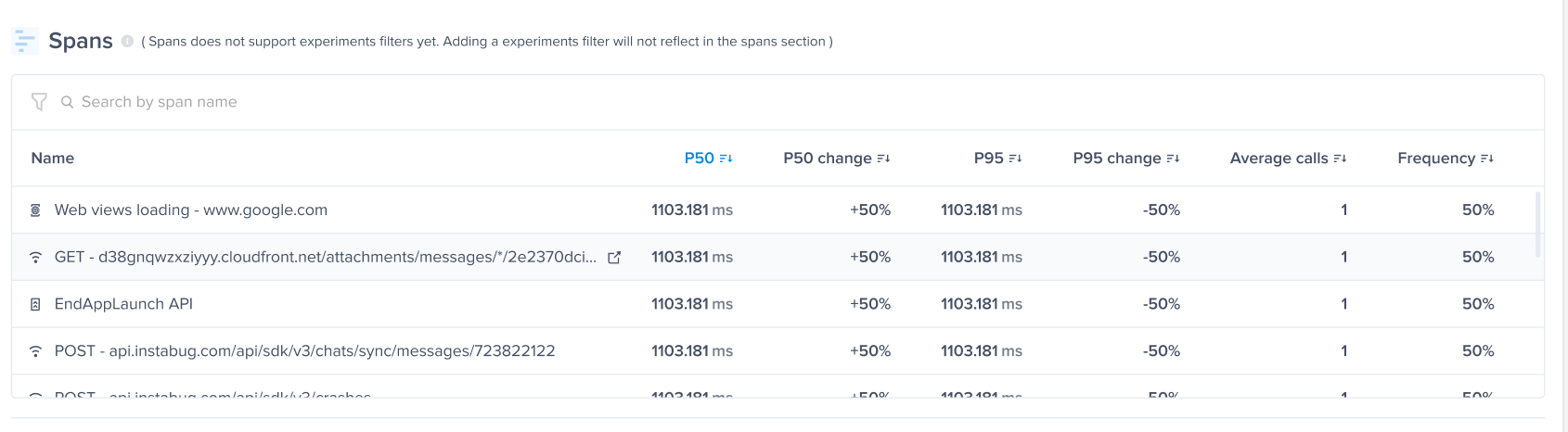 Because total Screen Loading time only tells half the story, you can see in the Spans breakdown how each span contributes to the total screen loading time. The WebViews Loading span shows the time it took to load the WebView and its content, along with the WebView URL for quick identification or debugging. You can also check all the other spans associated with the native components of the screen, such as native loading stages or network calls, so you can find the bottleneck wherever it may be.