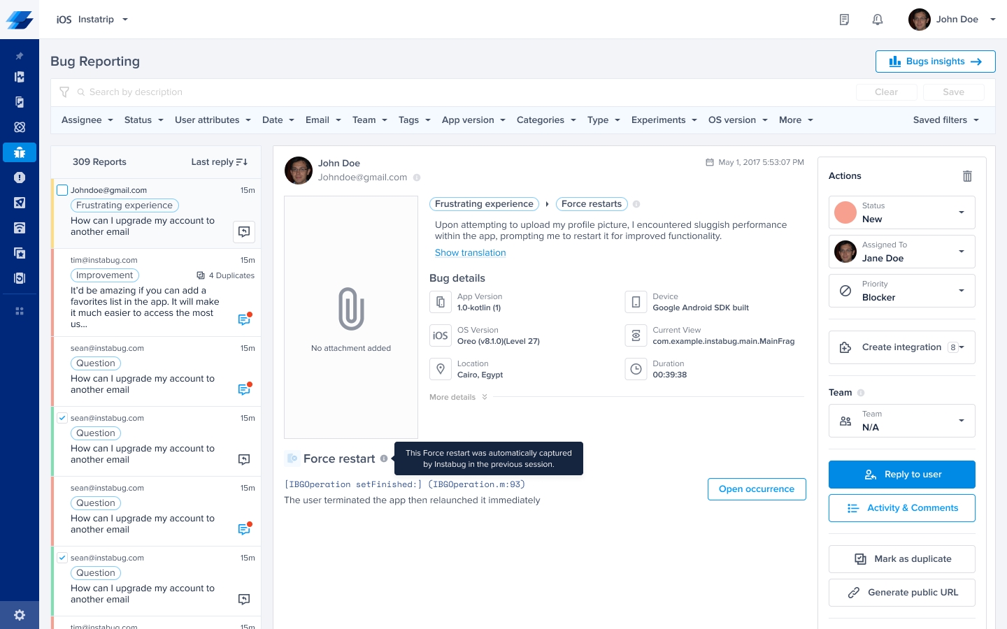 If you have our Force Restart product enabled as part of your plan, users will be prompted to submit their feedback and explain what triggered them to force restart the app.