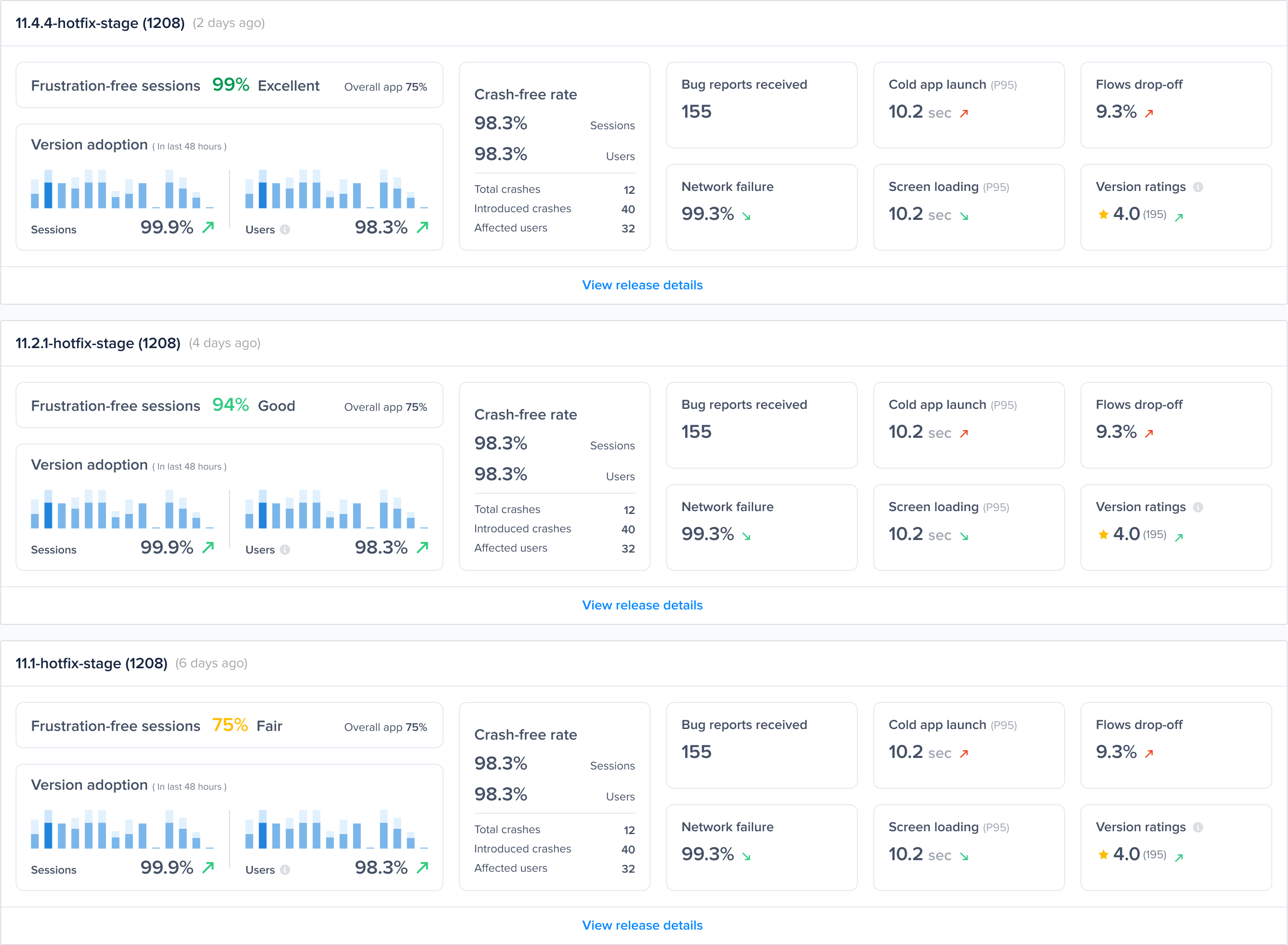 From the releases page, you’ll be able to see the Average Rating for each release. This average rating is calculated based on the star rating associated with each review the user wrote on the store for this app version.