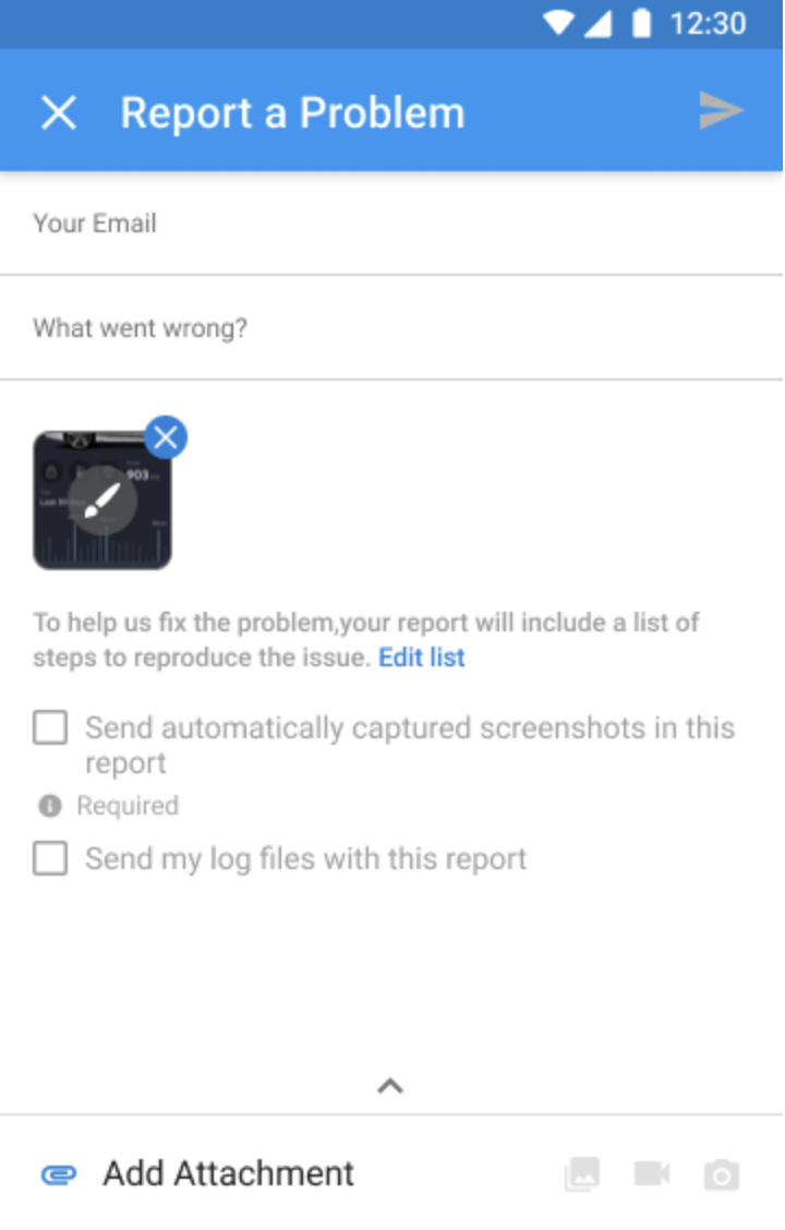 You can also automatically capture a screen recording of your app up to the last 30 seconds before a report is sent. By default, this is disabled. Your users will also be prompted once the recording starts at the beginning of the session and will have the ability to remove the video from the attachments when sending the report. The auto screen recording attachment counts towards the limit of 4 attachments in total.