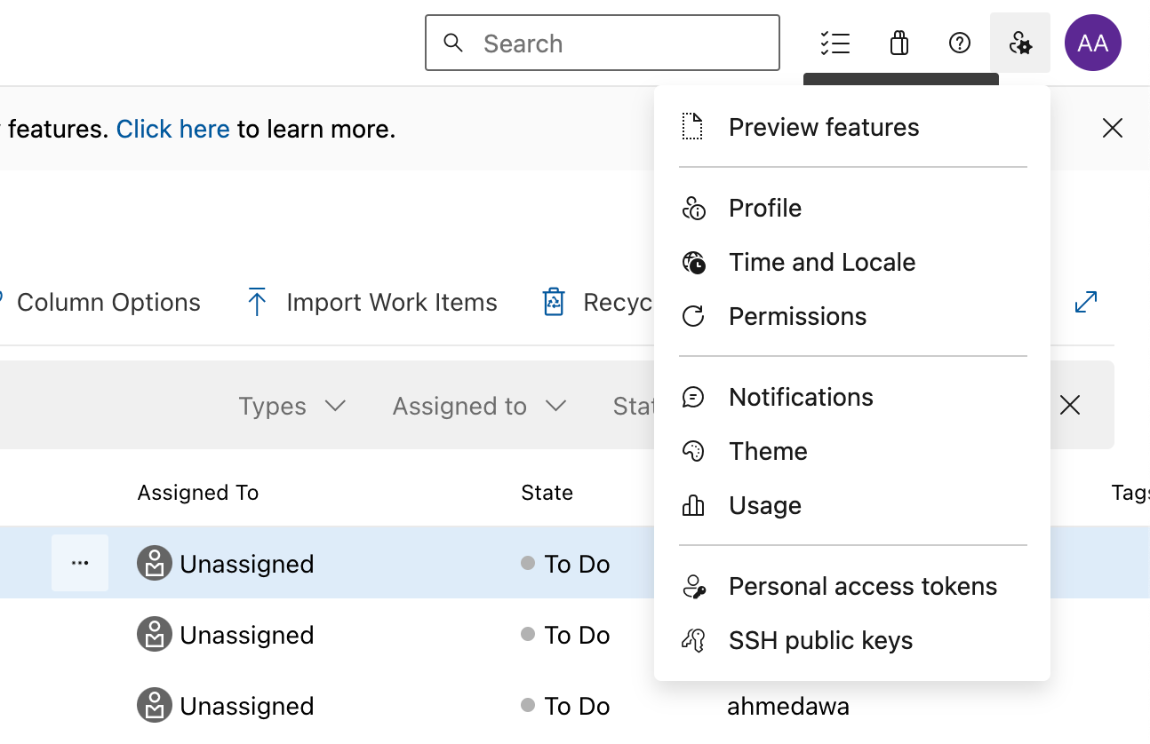 - Choose Personal Access Token, or navigate to this URL: https://dev.azure.com/{ORGANIZATION}/_usersSettings/tokens