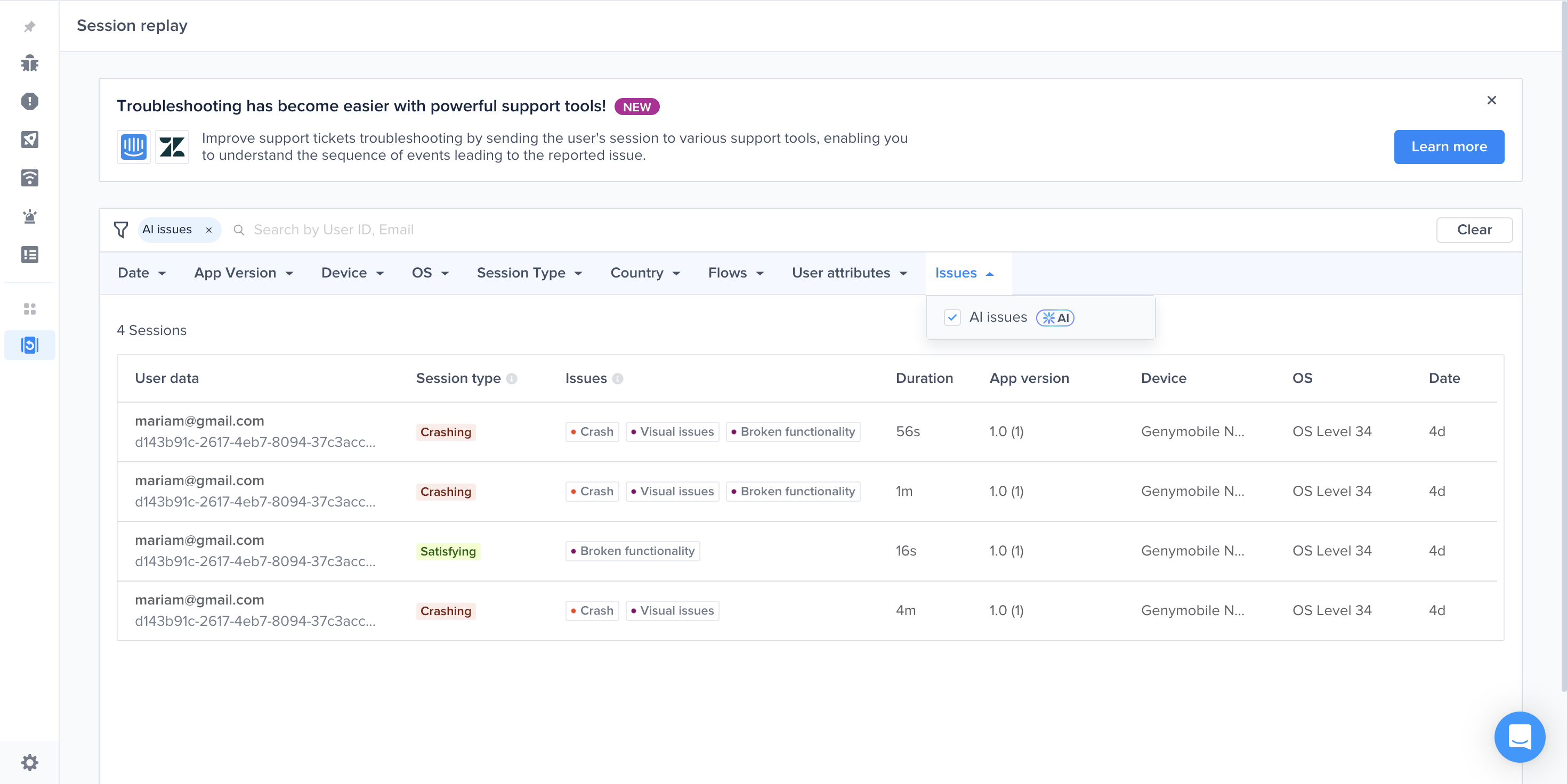 - No instrumentation changes required - once enabled, existing session screenshots, user flow and app behavior are routed to broken functionality analysis pipeline.