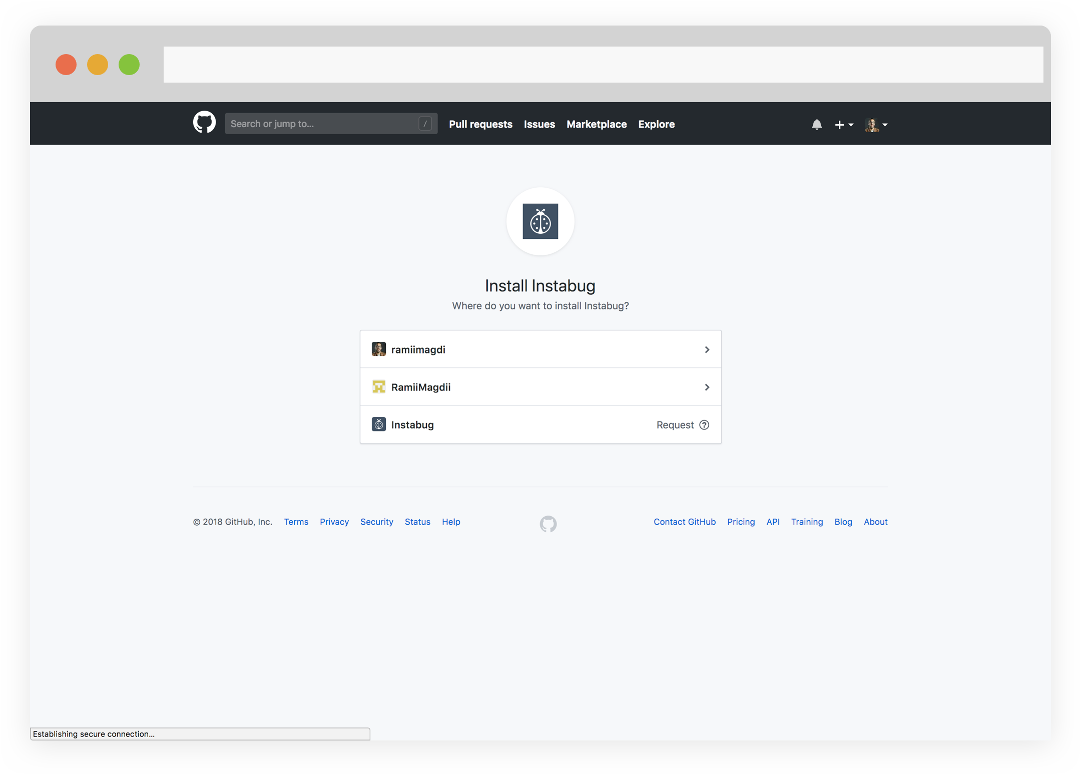 - When adding an Organization, you will be redirected to GitHub to pick an organization to Install Luciq in.