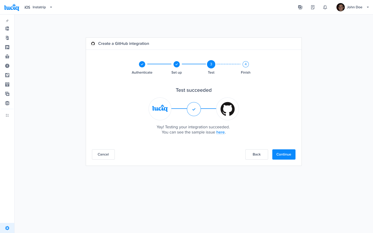 - You will be redirected back to Luciq to complete the setup. Now you only have to choose the repository and assignee for the forwarded issues. You can also choose which details get forwarded as well.