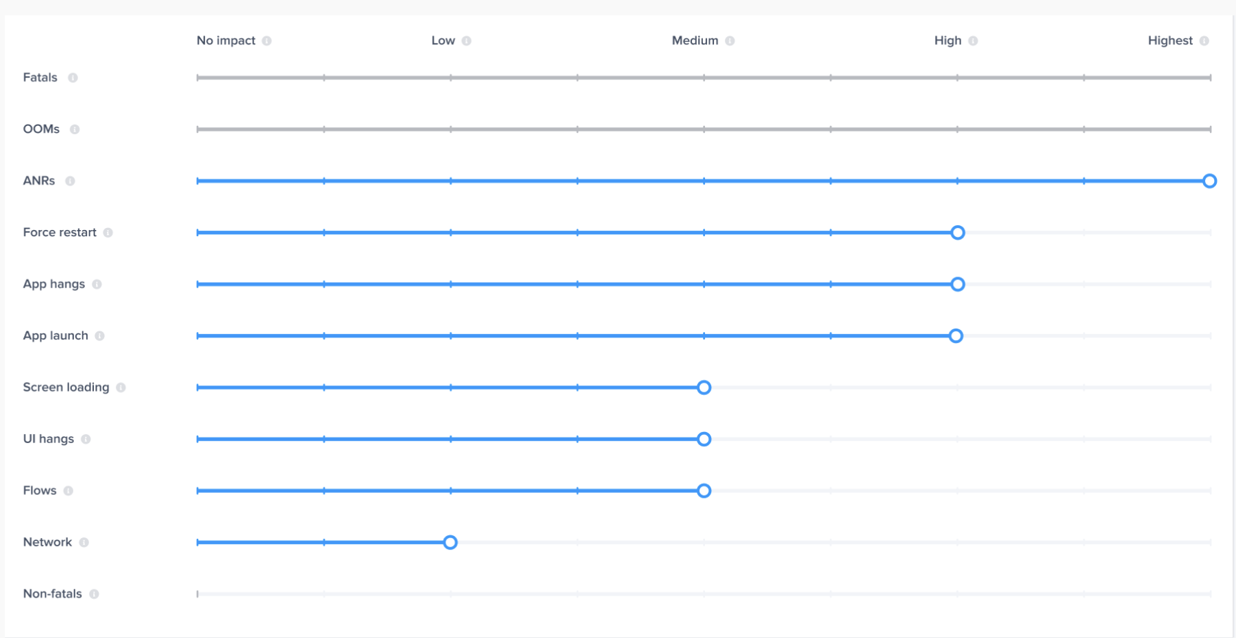 Fatals, OOMs, and ANRs to highest impact since they completely disrupt the experience and should have the strongest influence on the score.