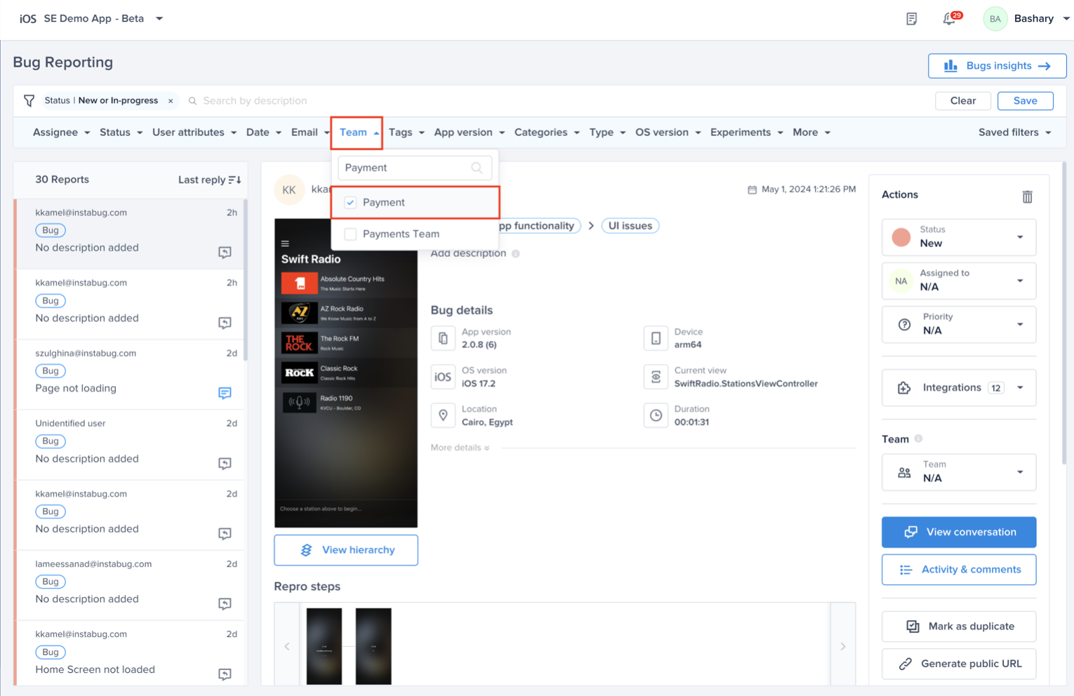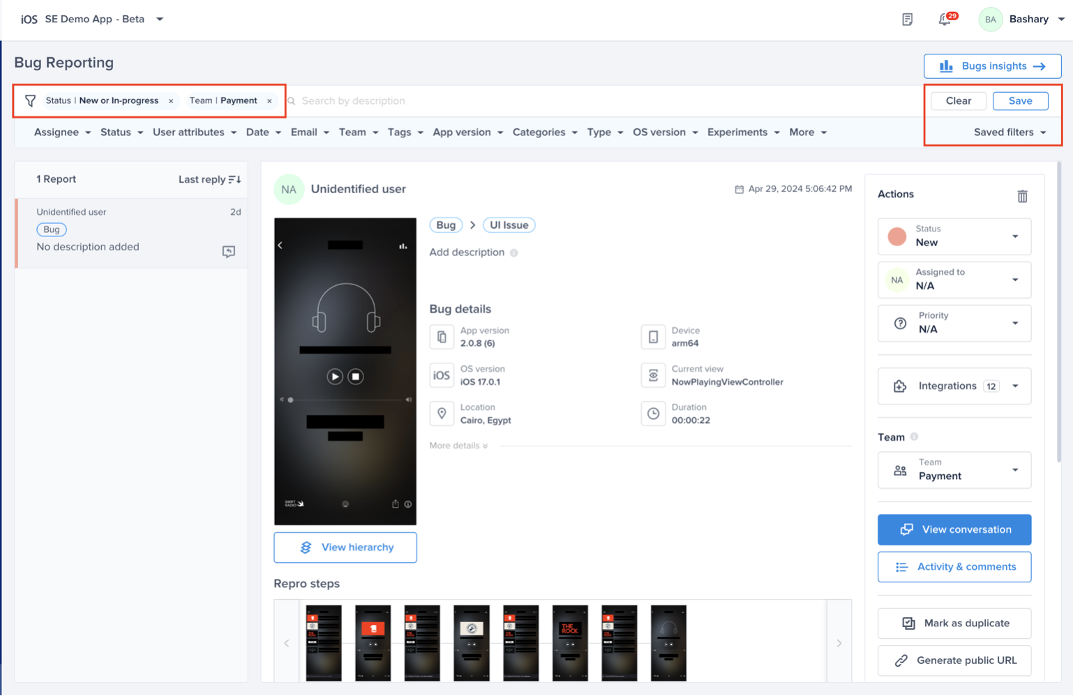 As you can see below, you can prioritize the bugs related to your team only and get more granular with the options to filter. For example, Payment team wants to focus on bugs status' new or in-progress. Also, you will be able to save those filters and you can access them from the right side of the filter bar.