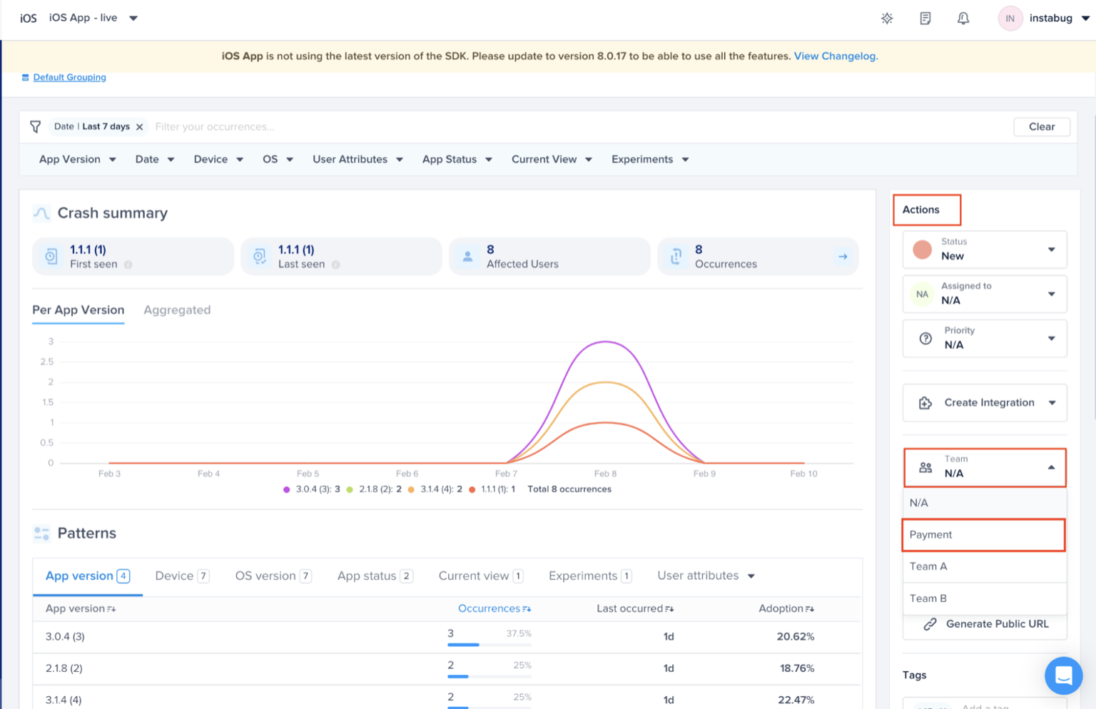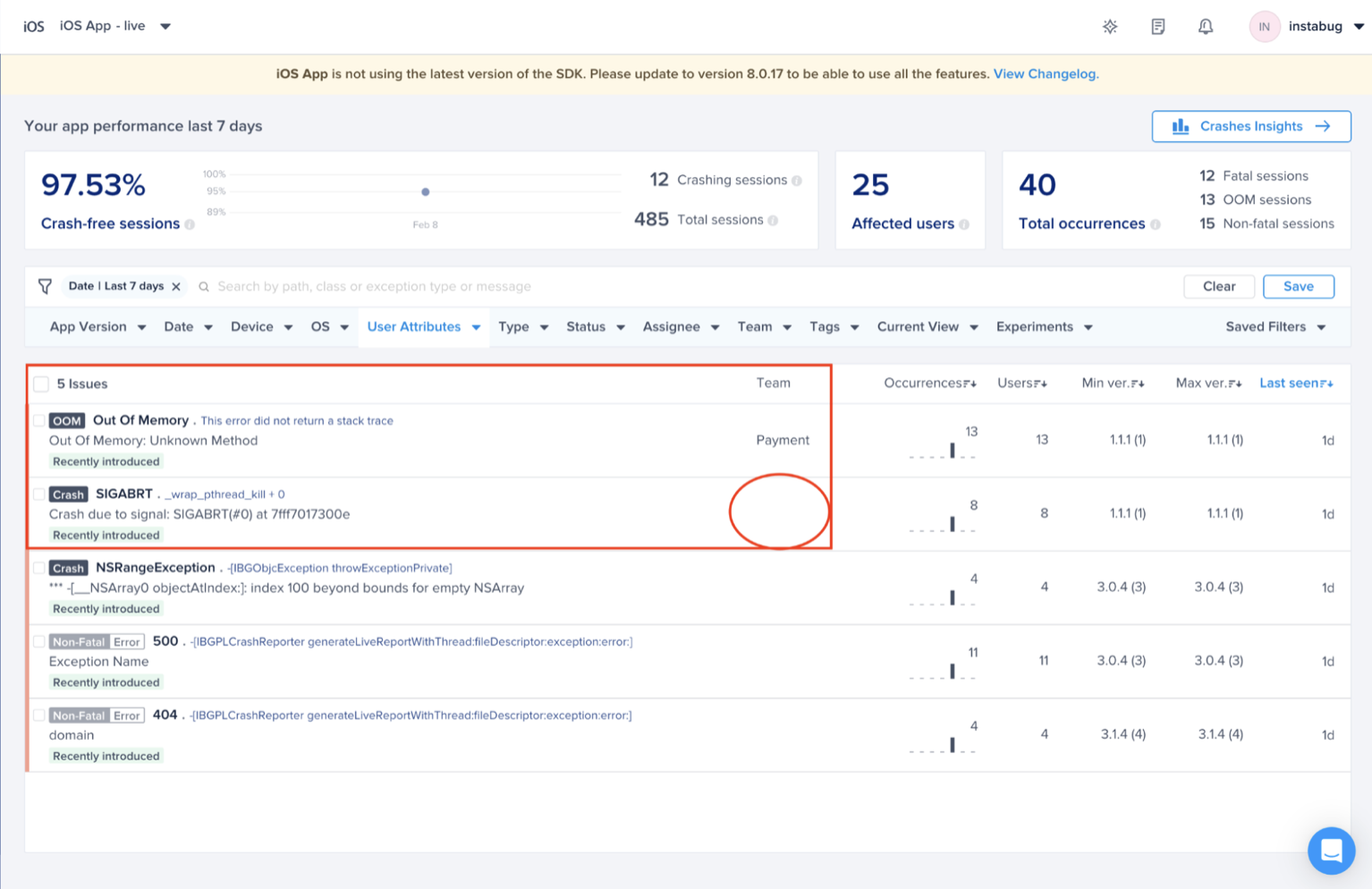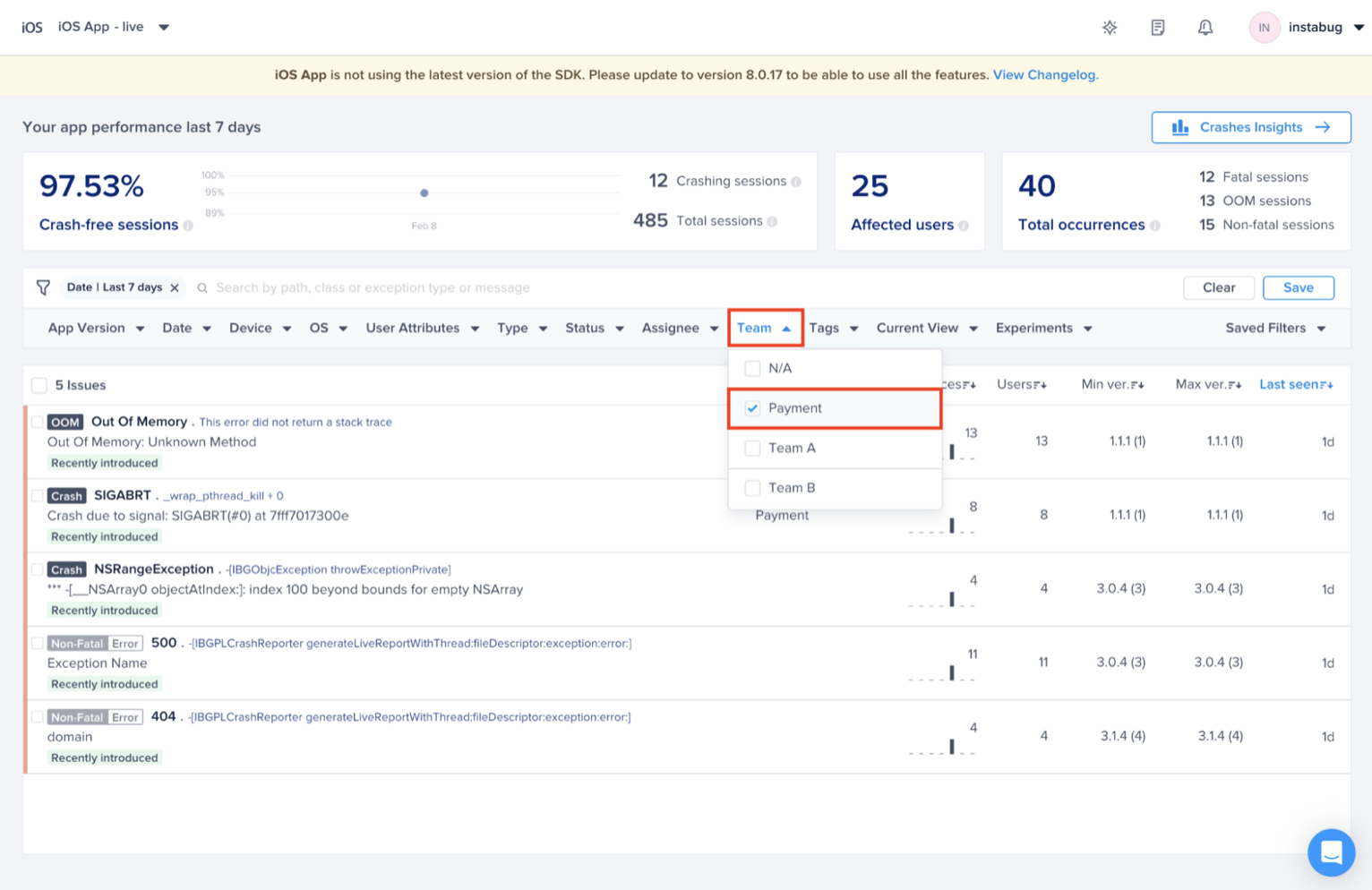 As you can see below, you can prioritize the crashes related to your team only and get more granular with the options to filter. For example, Payment Team wants to focus on crashes seen in a certain app version. Also, you will be able to save those filters and you can access them from the right side of the filter bar.