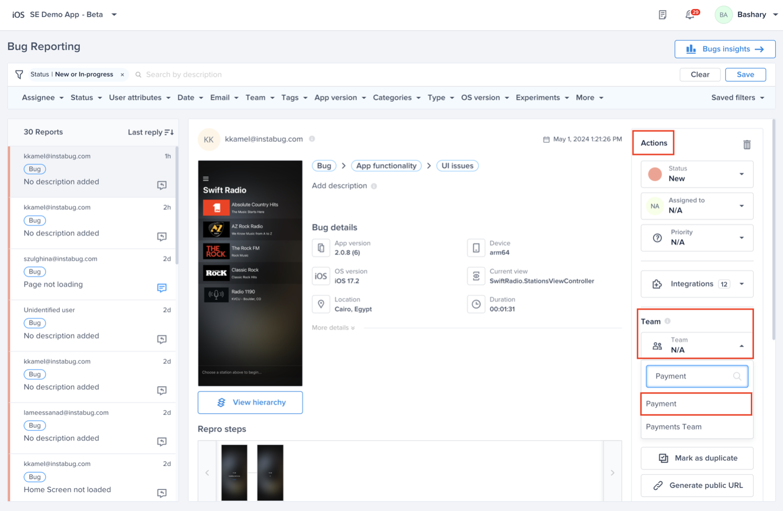 Go to bugs from the left sidebar of the dashboard and then click on the bug that you want to assign to a certain team