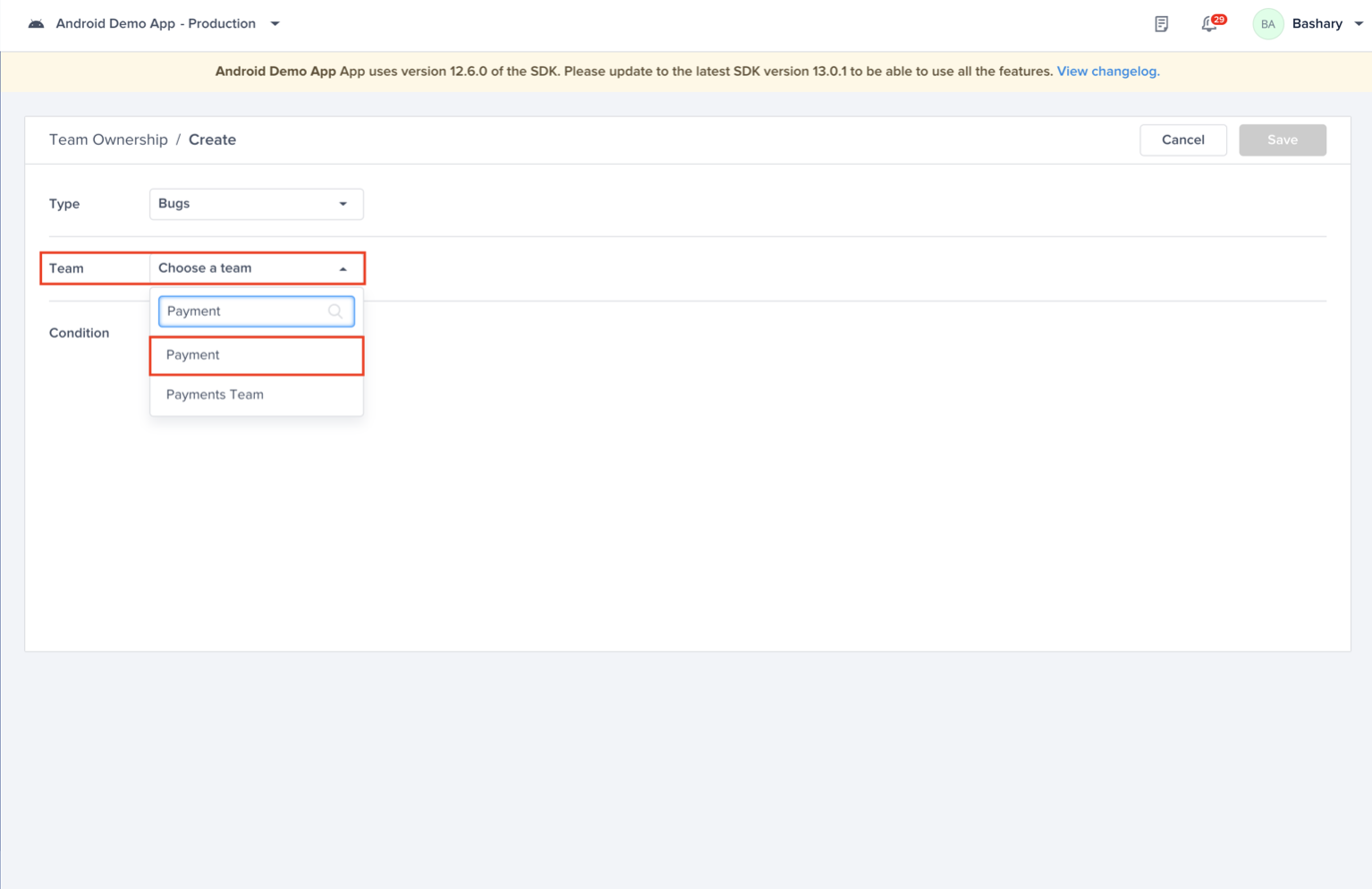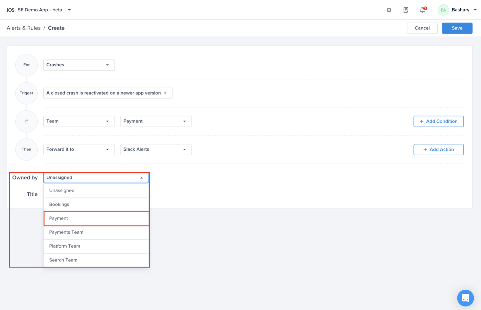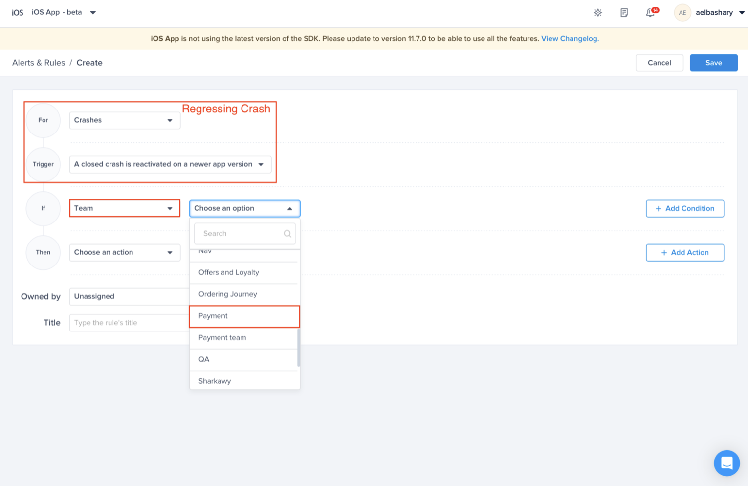 Choose the condition (Regression) you want to be alerted to whenever it is assigned to “Payment” team