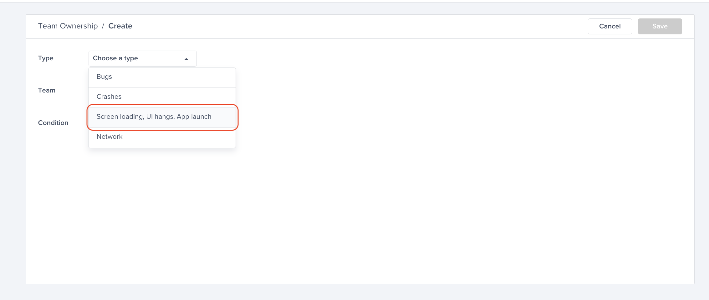Choose the “Screen loading, UI hangs, and App Launches” type, then choose the payments team.
