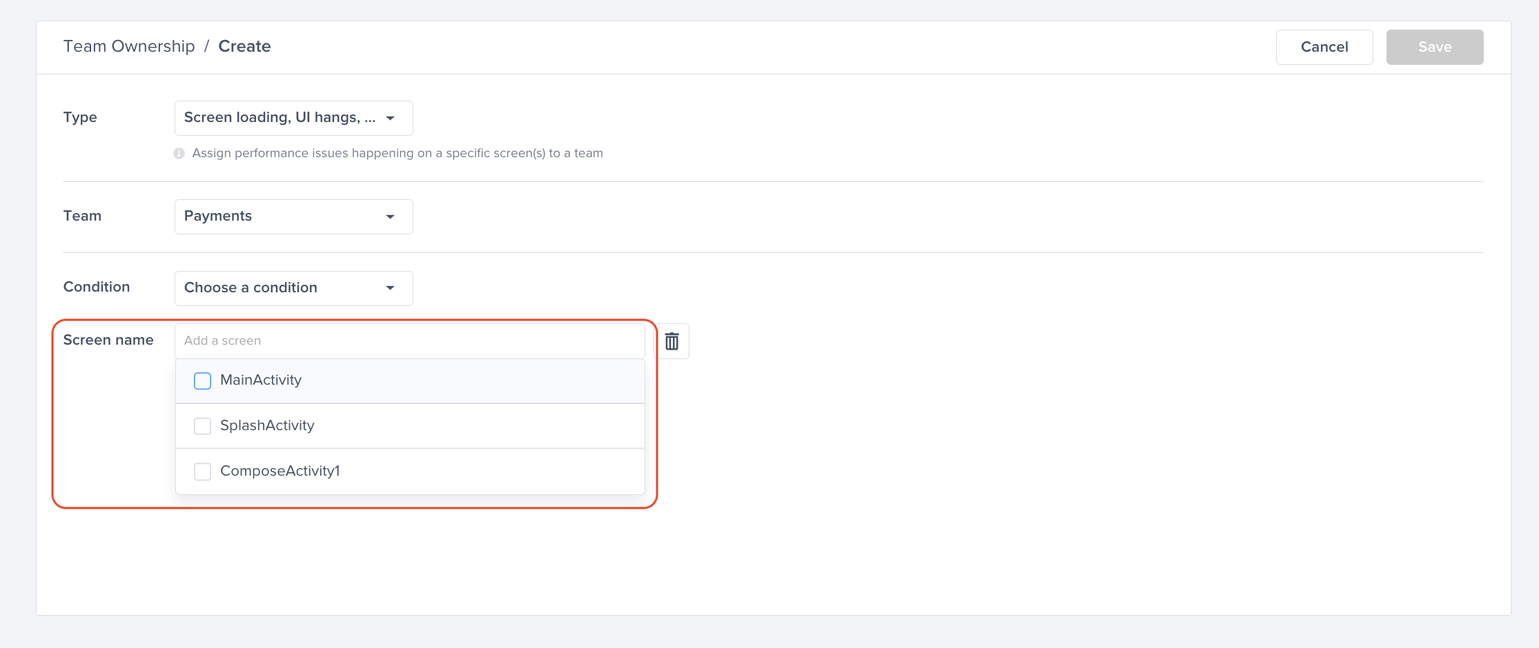 For Screen loading, UI hangs, and App Launch, the same team can be assigned to multiple screen names, but the same screen cannot be assigned to multiple teams.