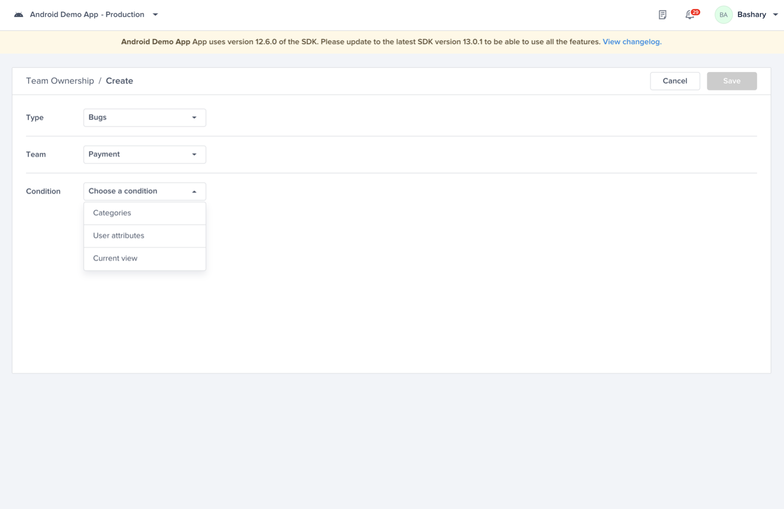 Bugs: Define teams based on categories, user attributes, and current view (screen name).