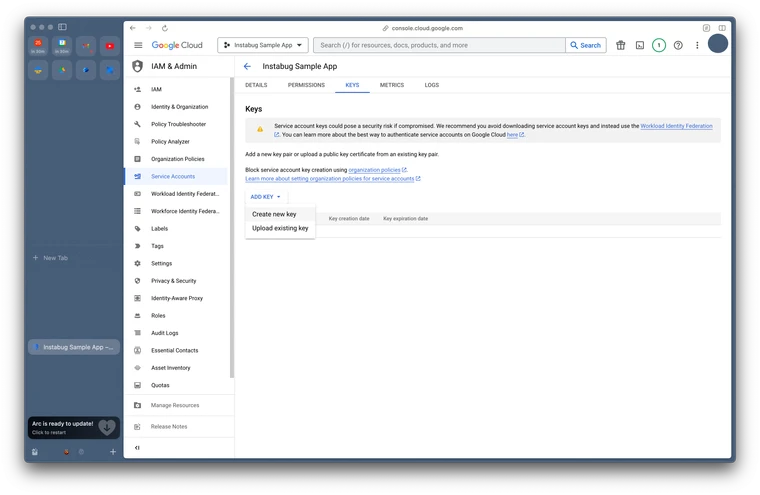 Create a new key: After you've granted permissions, click on the service account name and then select the "Keys" tab. Click the "Create new key" button.
