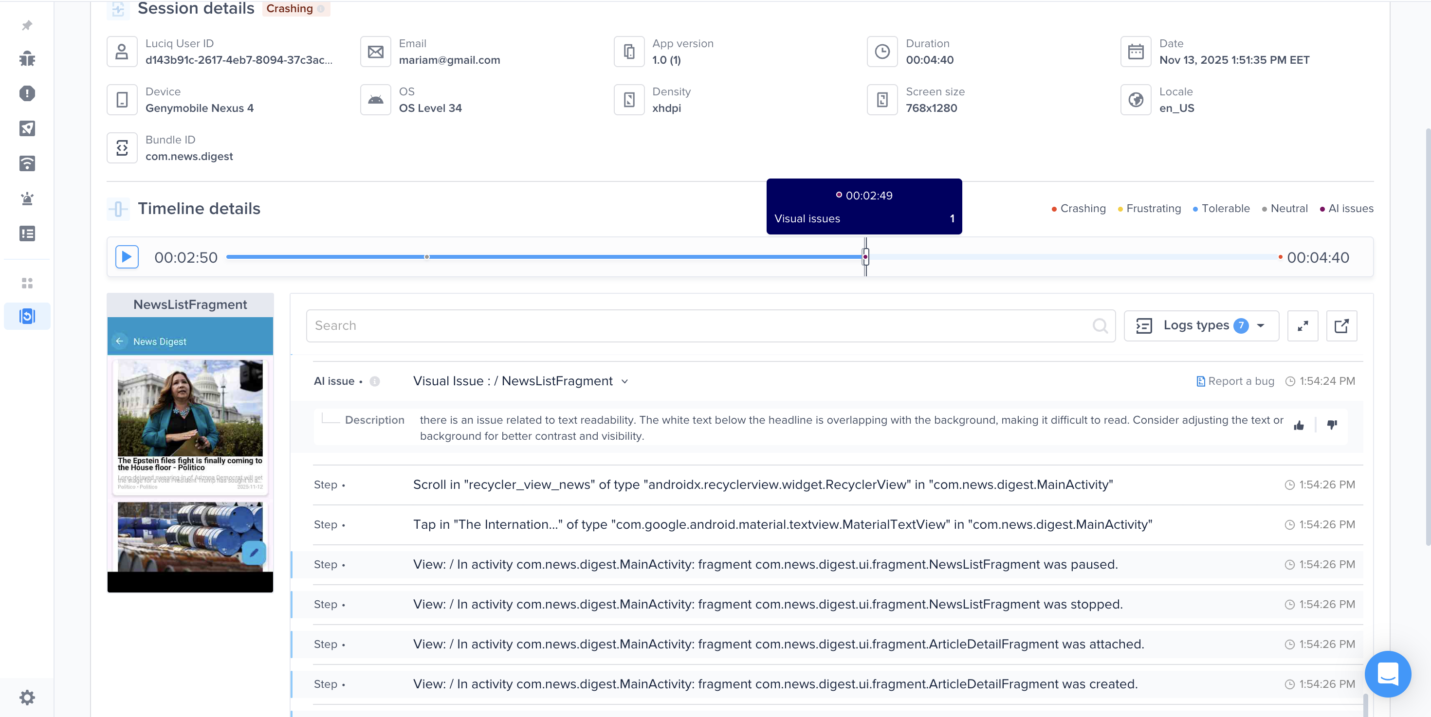Click the purple dot on the timeline to jump directly to the issue’s screenshot view.
