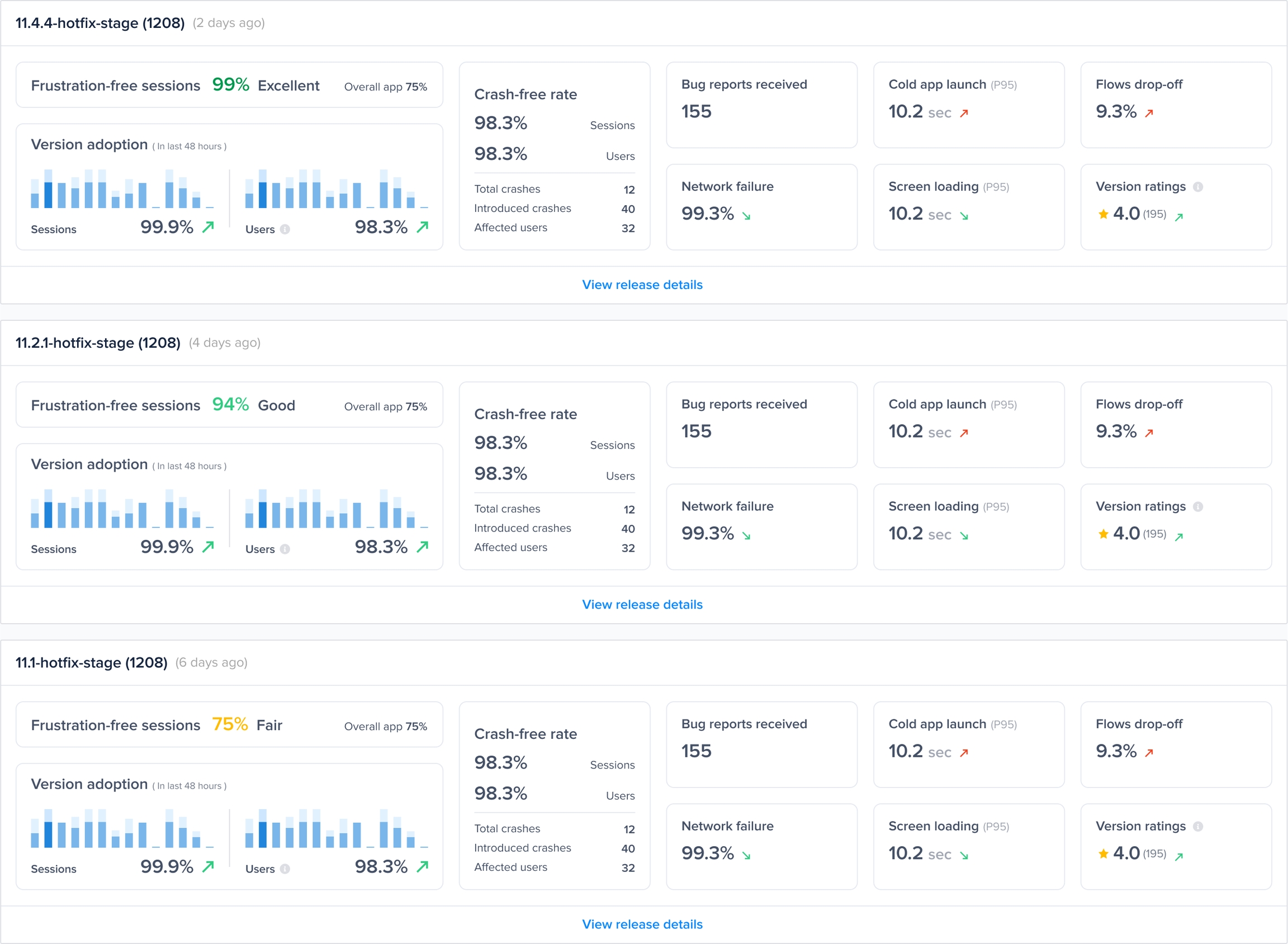 From the releases page, you'll be able to see the Average Rating for each release. This average rating is calculated based on the star rating associated with each review the user wrote on the store for this app version.