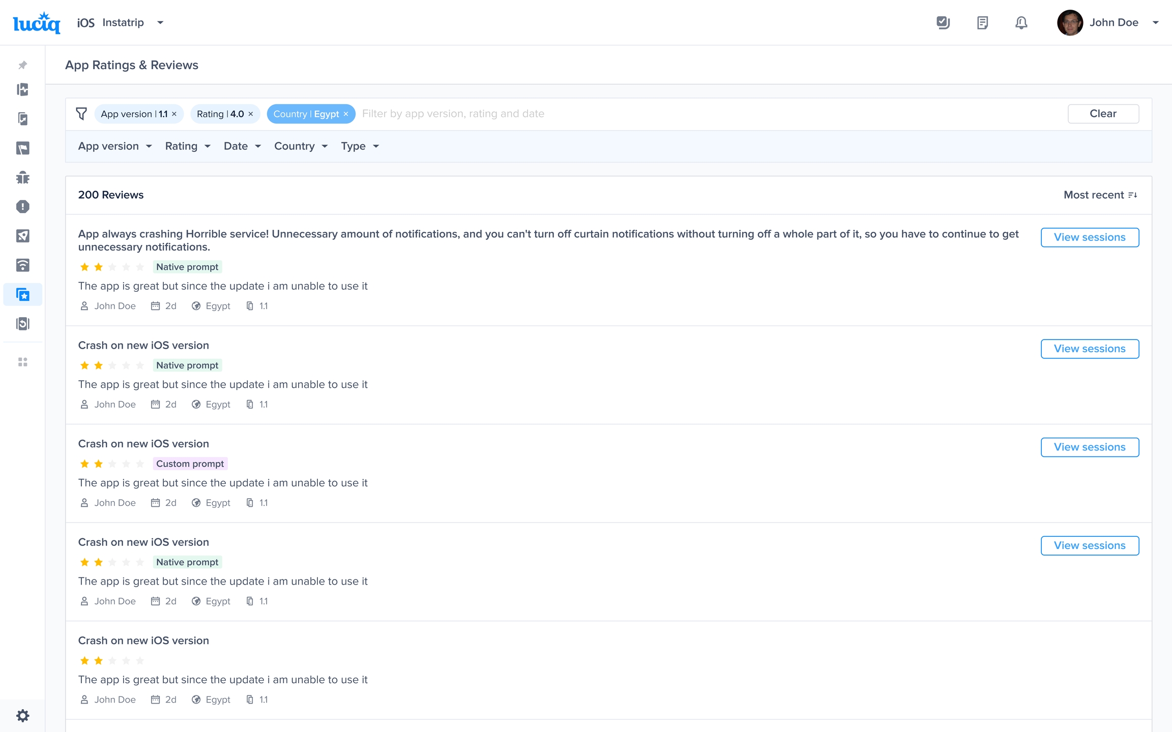 Tracking your app’s ratings and reviews is only the first step. Combining Ratings and Reviews with Luciq’s Session Replay allows you to view a list of the sessions related to a specific review and replay them to understand the experience that led to that review.