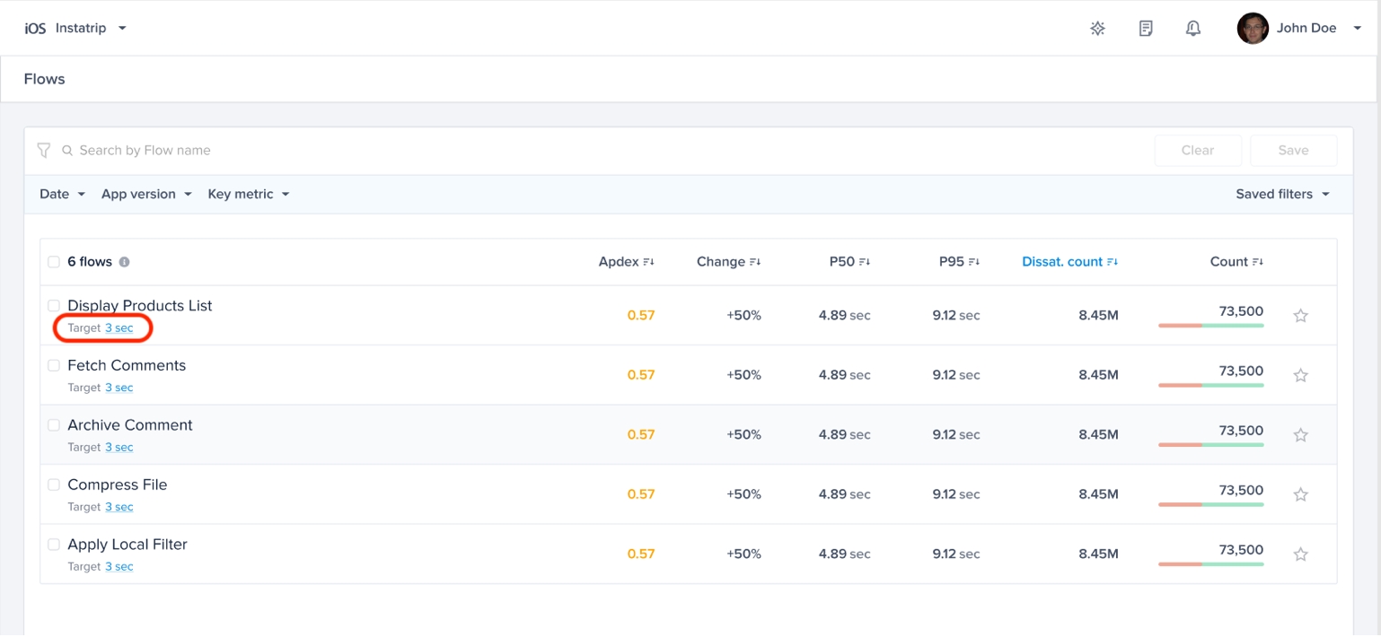 By default, the target for all Flows is set to 0.5 seconds; however, you can easily change this number from your dashboard by clicking on the target highlighted next to each Flow or inside the flow details page.