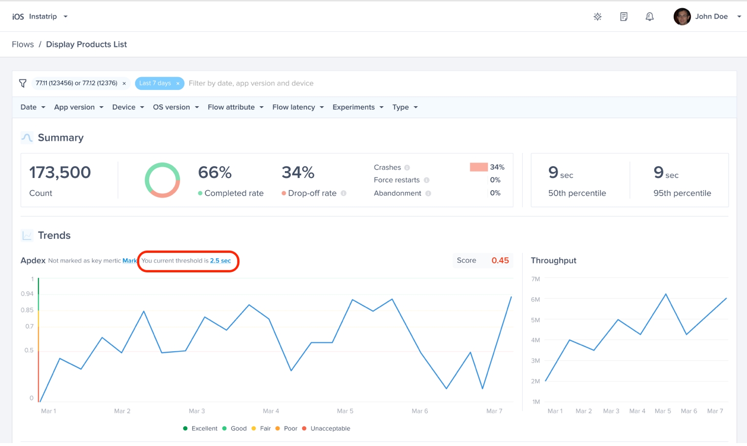 Luciq calculates an Apdex score that reflects the performance of your Flows. An Apdex score ranges between 0 and 1; the higher the value, the better the performance: