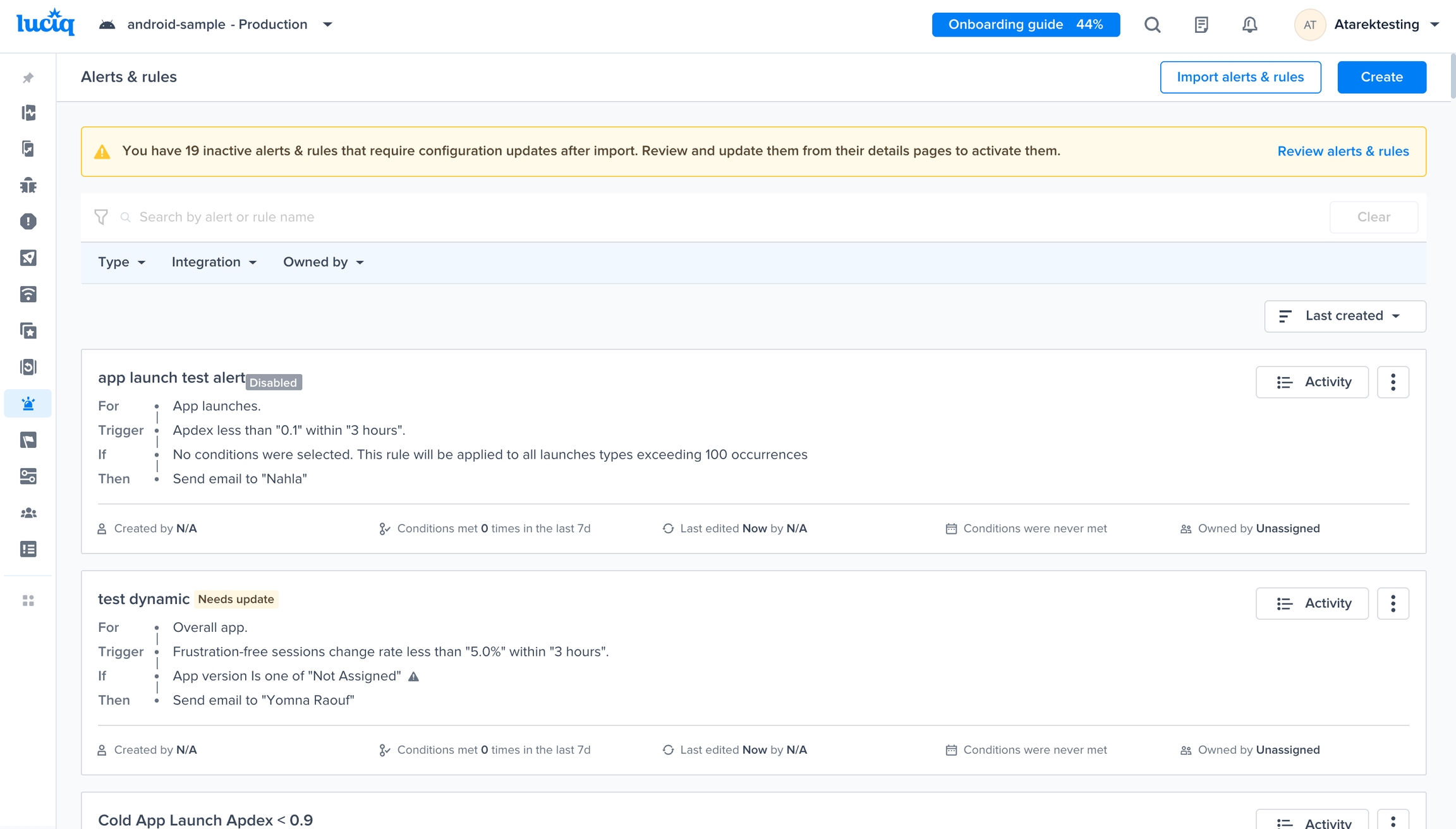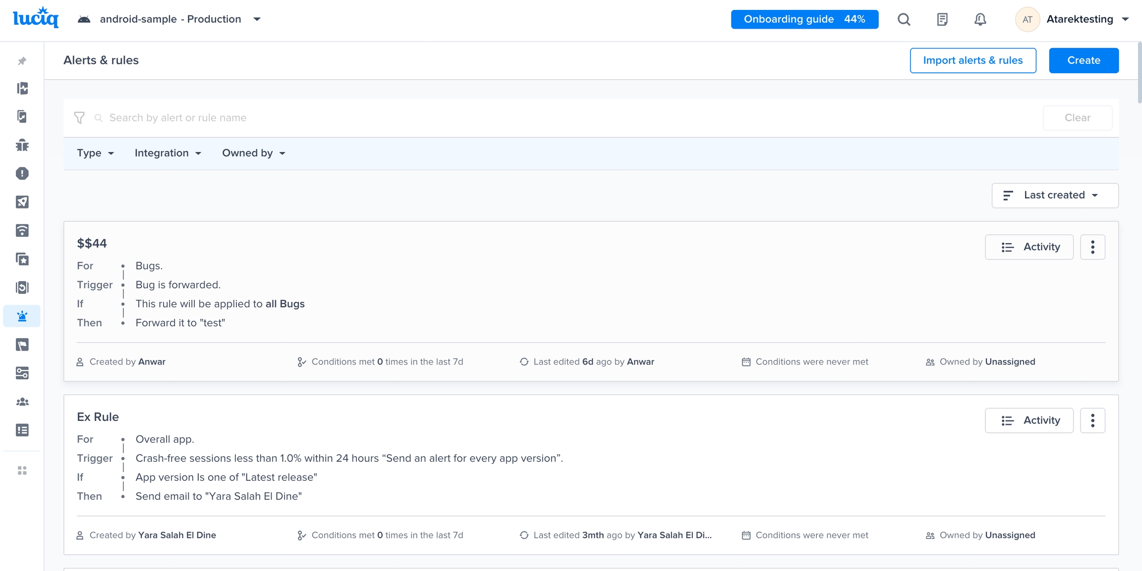 Luciq enables you to seamlessly reuse existing alerts and rules across your applications and environments on Luciq. This feature helps you: