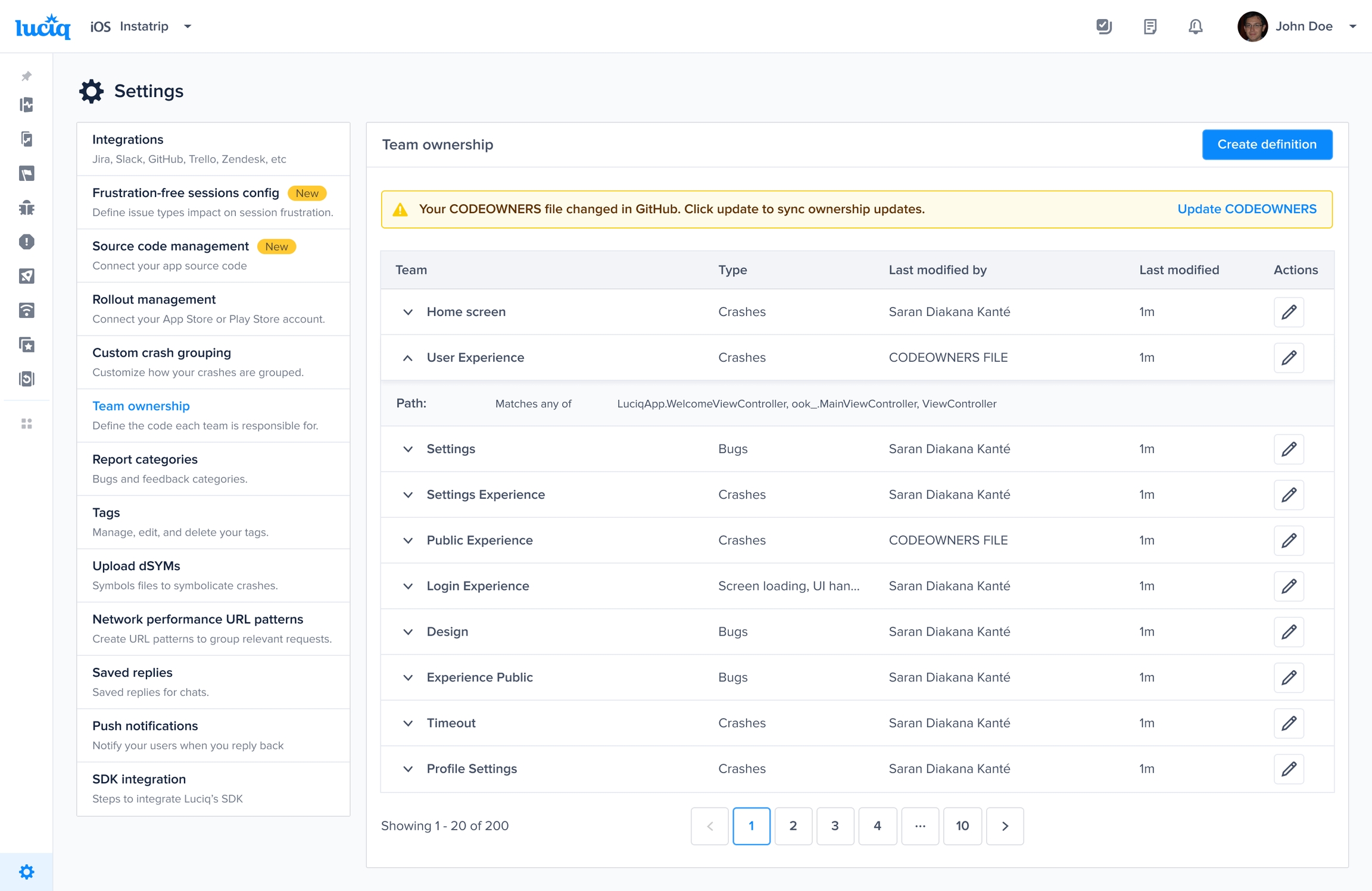 The GitHub CODEOWNERS integration allows Luciq to automatically generate and maintain Crashes team ownership rules based on the CODEOWNERS file in your GitHub repository.