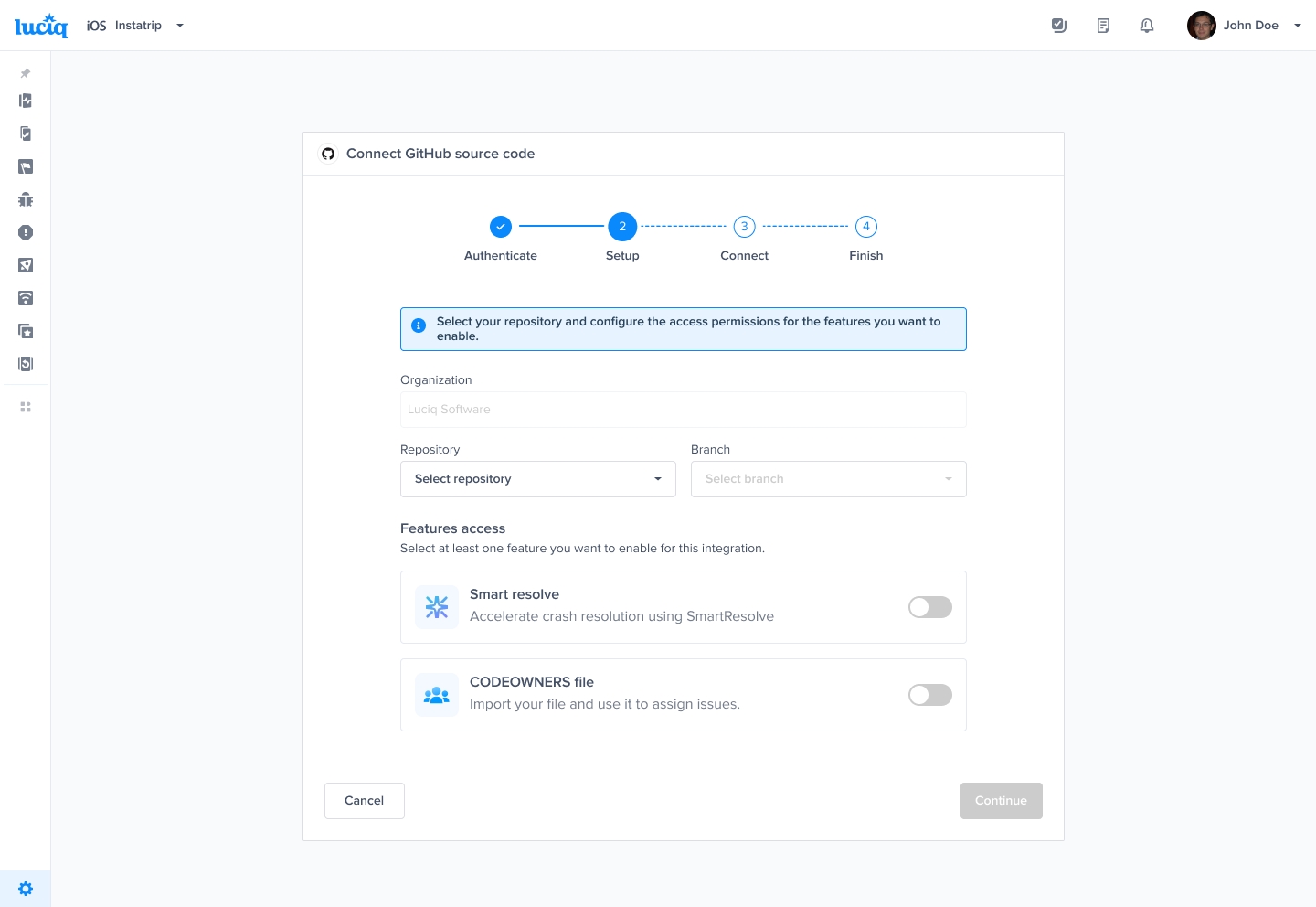 Finally once you confirm all settings and click Connect, Luciq will fetch and process the CODEOWNERS file