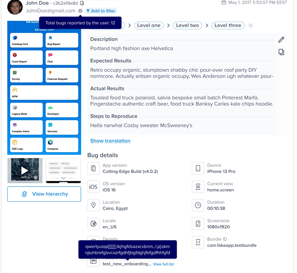 If enabled, the Extended Bug Report adds a second step to the bug reporting flow that your testers experience in your app.