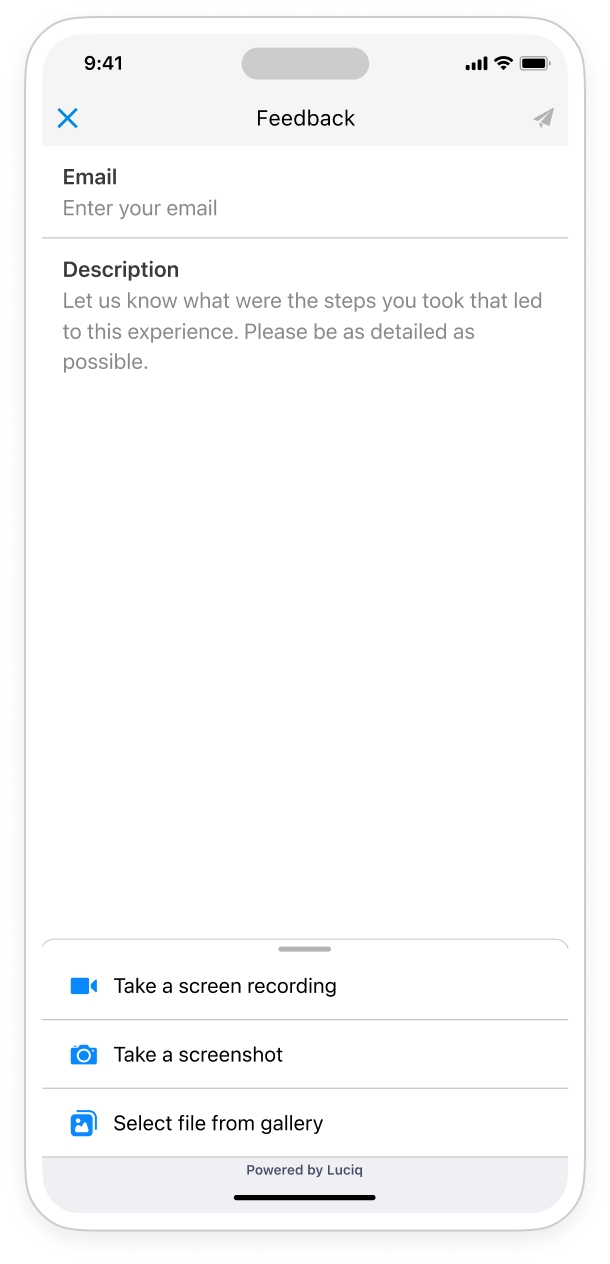 If enabled, users will first see a modal asking if they want to report this experience. If their answer is yes, they will see a Feedback description model that allows them to enter their email and describe their experience using their own words.