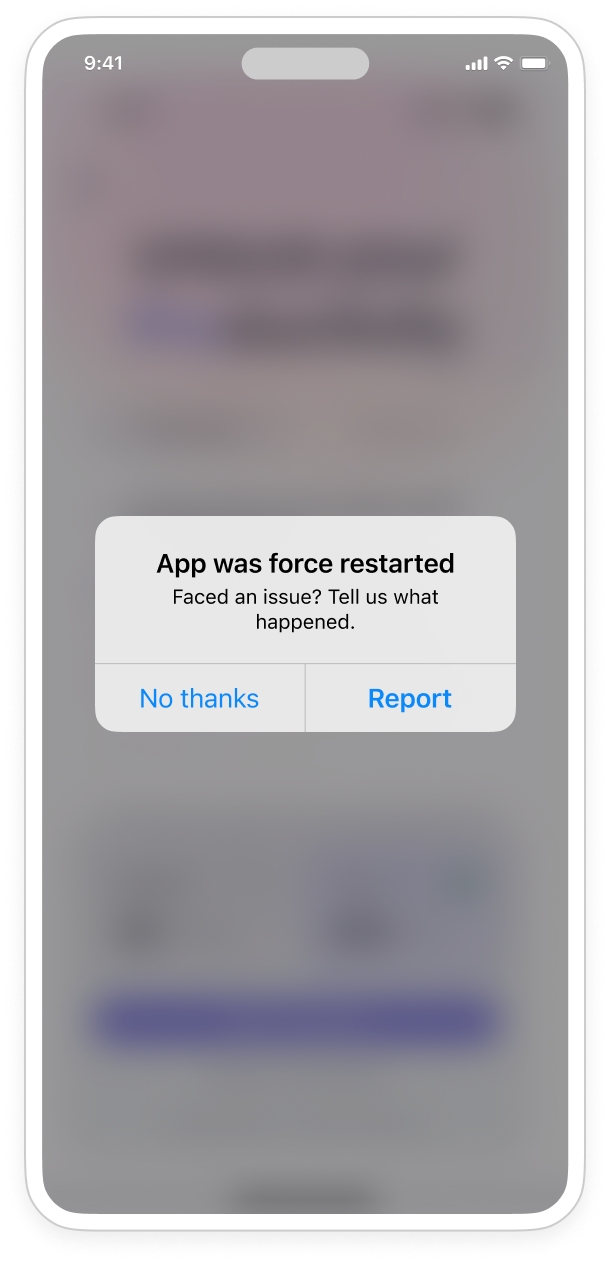 Once the SDK captures a Force Restart occurrence, a modal will be triggered to ask your end-users if they want to share their feedback and experience.