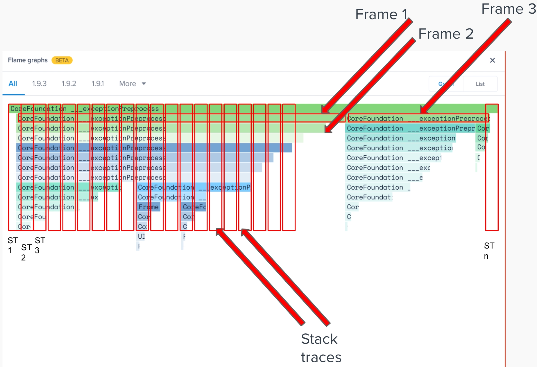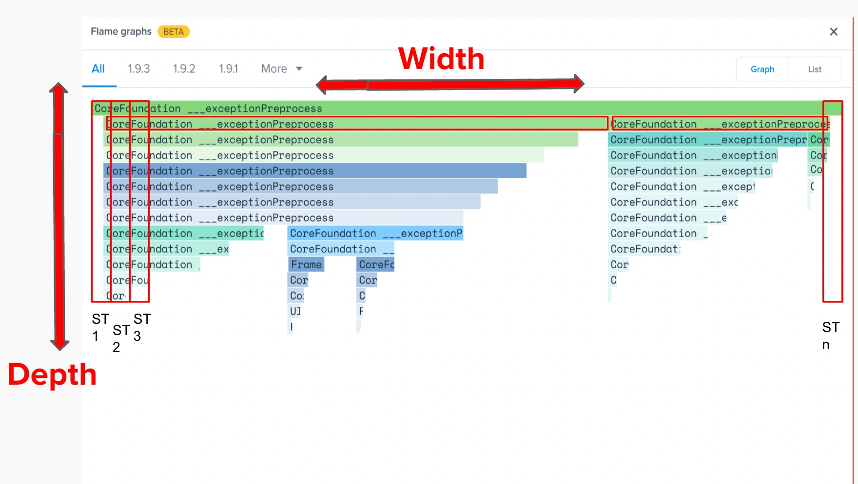 The width of the bars for each frame would show the frequency of the frame to show up in the stack trace.