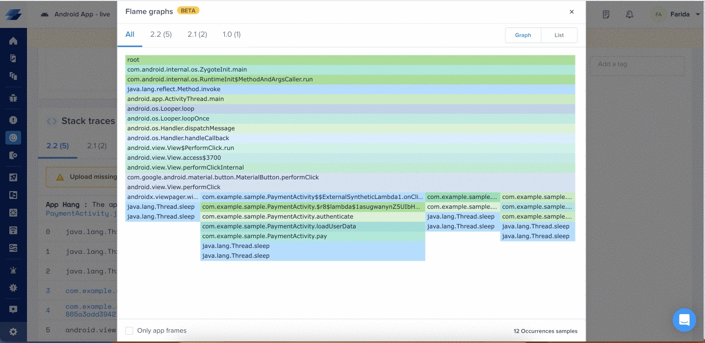 Along with the available debugging data that comes with ANRs and App Hangs, you can debug those frustrating experiences by seeing the visual aggregations of the stack traces. You can also find the code paths that are frequently associated with the hangs so you can debug them to improve your app’s performance and user experience.