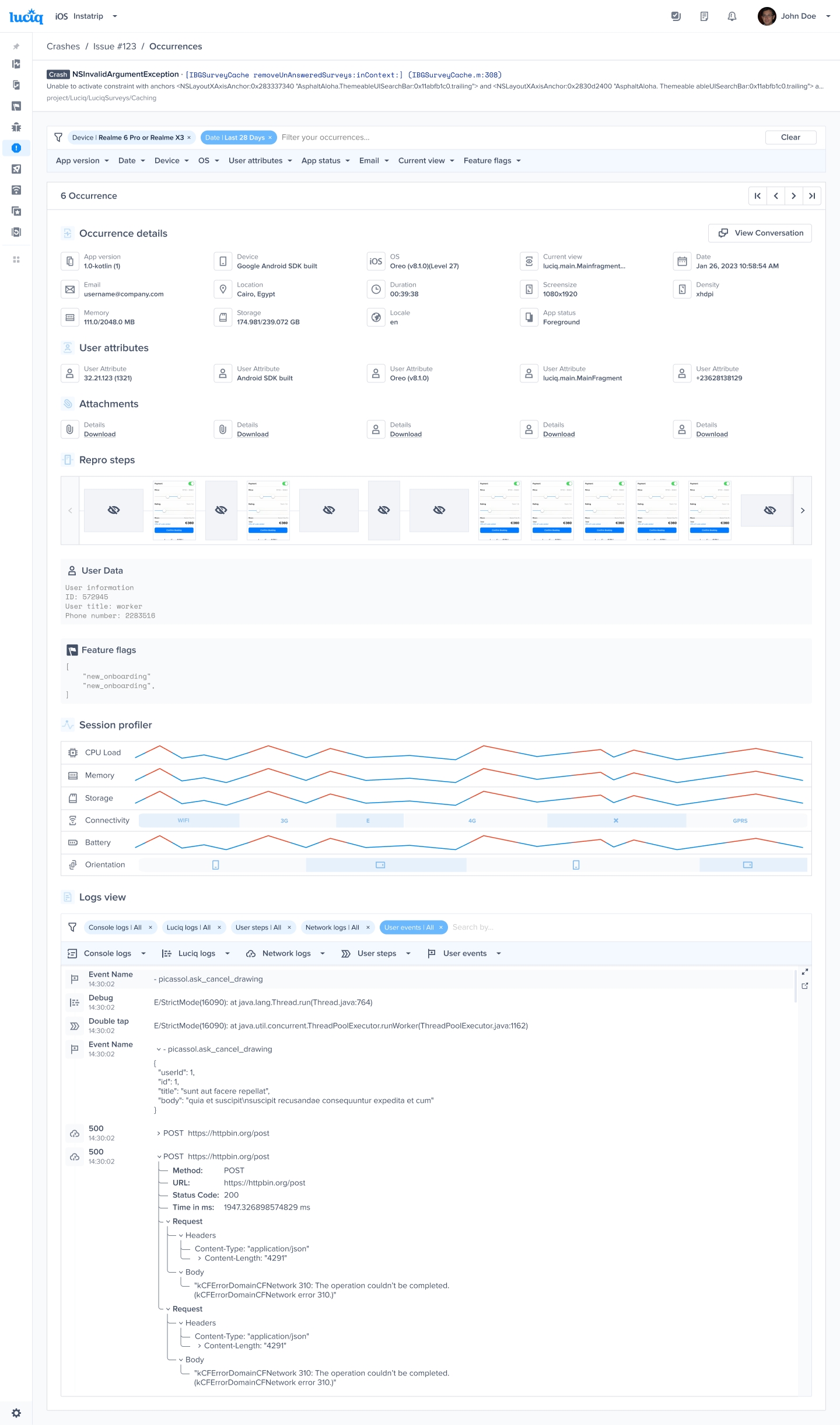 When using Luciq Crash Reporting, each occurrence comes with user attributes, user data, and attachments if available.