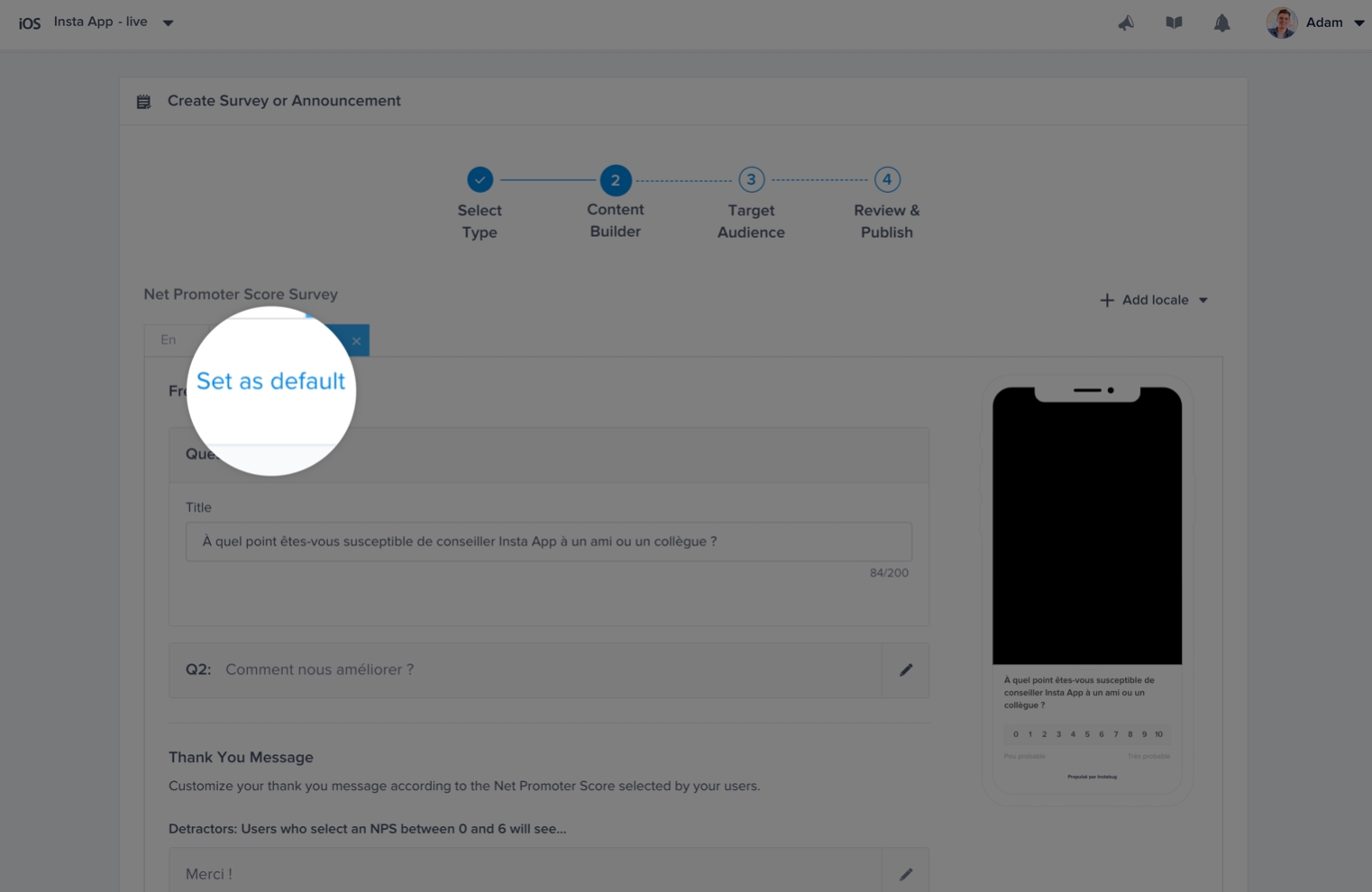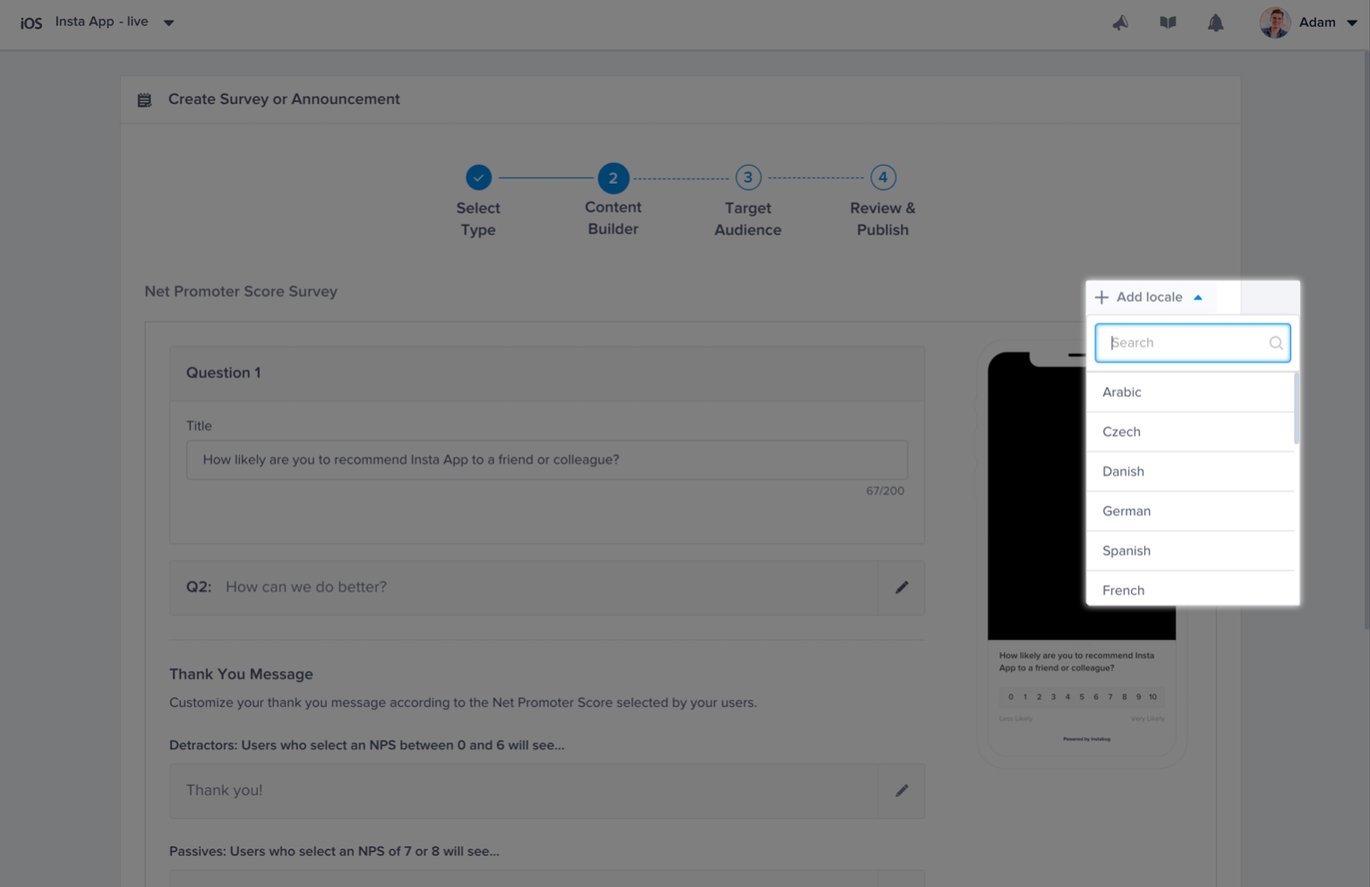 You can display your surveys and announcements to your users in their language. To do this, you only need to add the locale when creating the survey, then add the questions in that language.