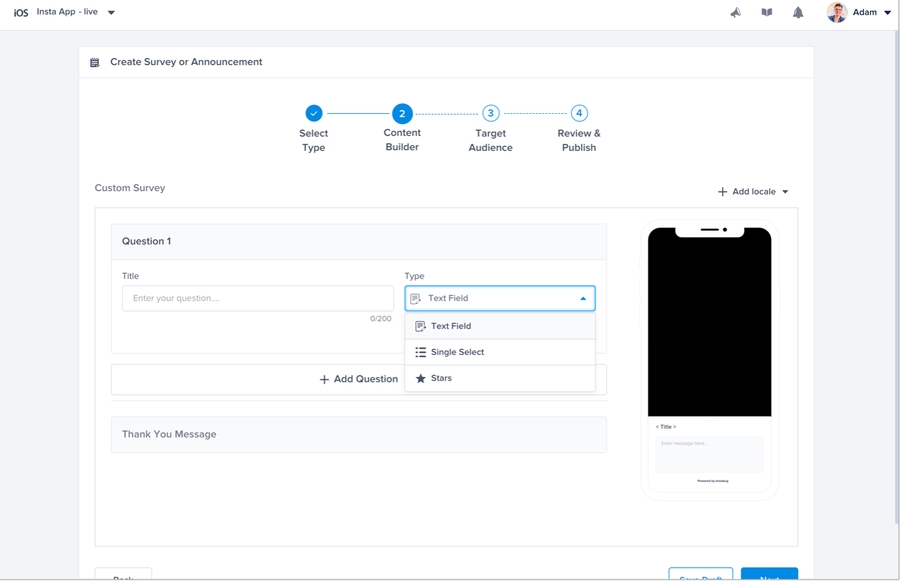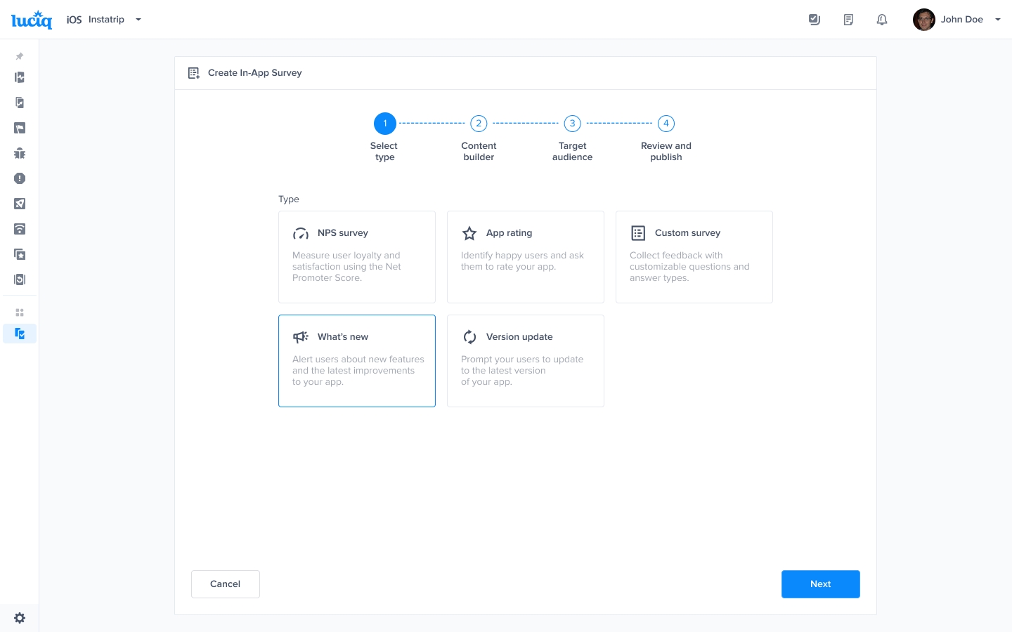 You can choose between three types of surveys when creating a new one: Custom Survey, NPS Survey, and App Rating.