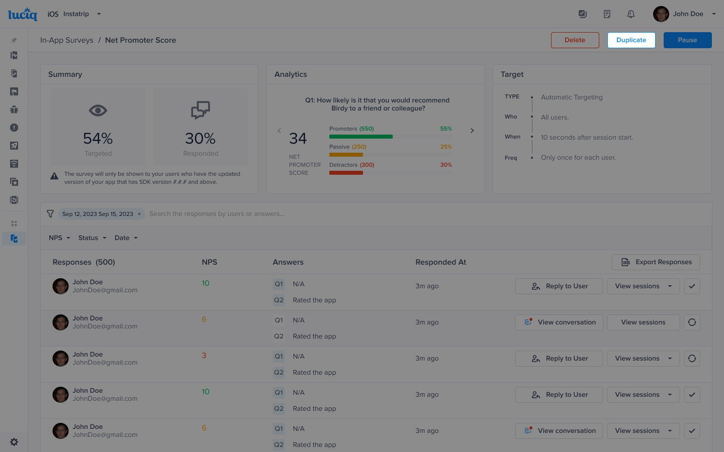You can create In-app surveys to collect feedback from your users. There are three different types of In app Surveys that you can create: