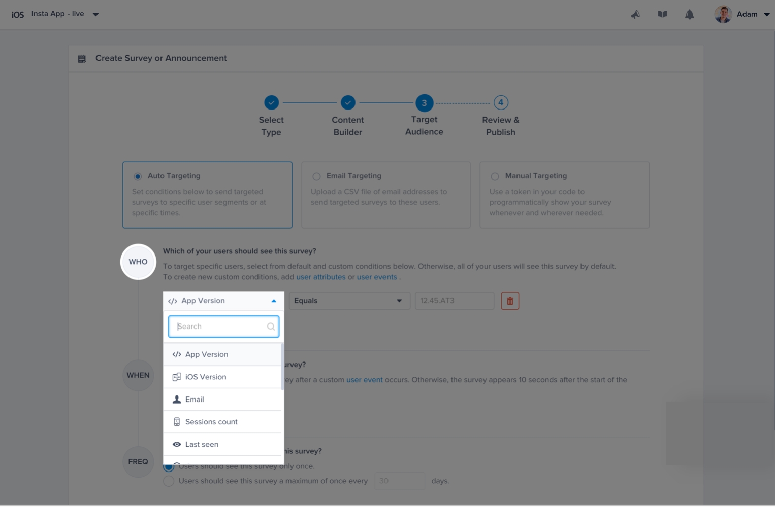 When you select Auto Targeting, you can define criteria for who should receive the survey. Your users matching the conditions you set will automatically see the survey. In addition to default attributes like App Version, OS, Email, Sessions Count, Last Seen, Country, etc., you can set conditions for custom user attributes or user events that you have created. Multiple different criteria of any type can be added.