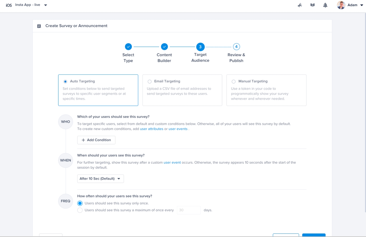 After choosing the survey type you want to create, you can target specific audiences using custom conditions.