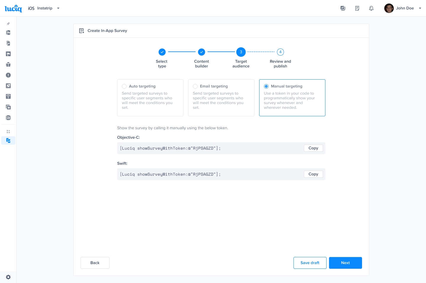 Each created survey has a unique token that you can refer to in your code, as explained in the following section. Please note that manual targeting can only be used with custom surveys, NPS surveys, and app ratings.