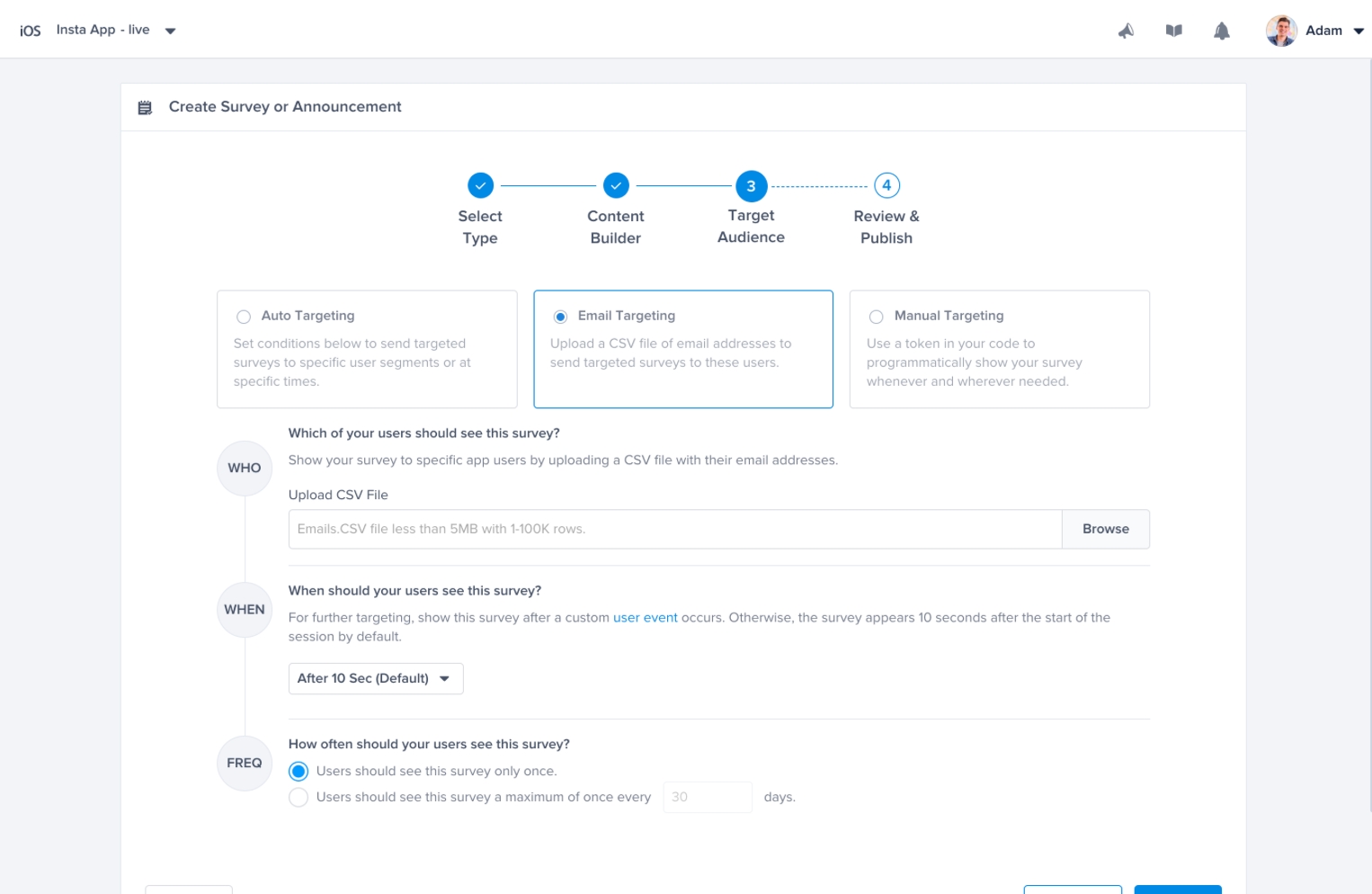 You can also use Manual Targeting to show your surveys to specific audiences, and these surveys can be re-shown any number of times.