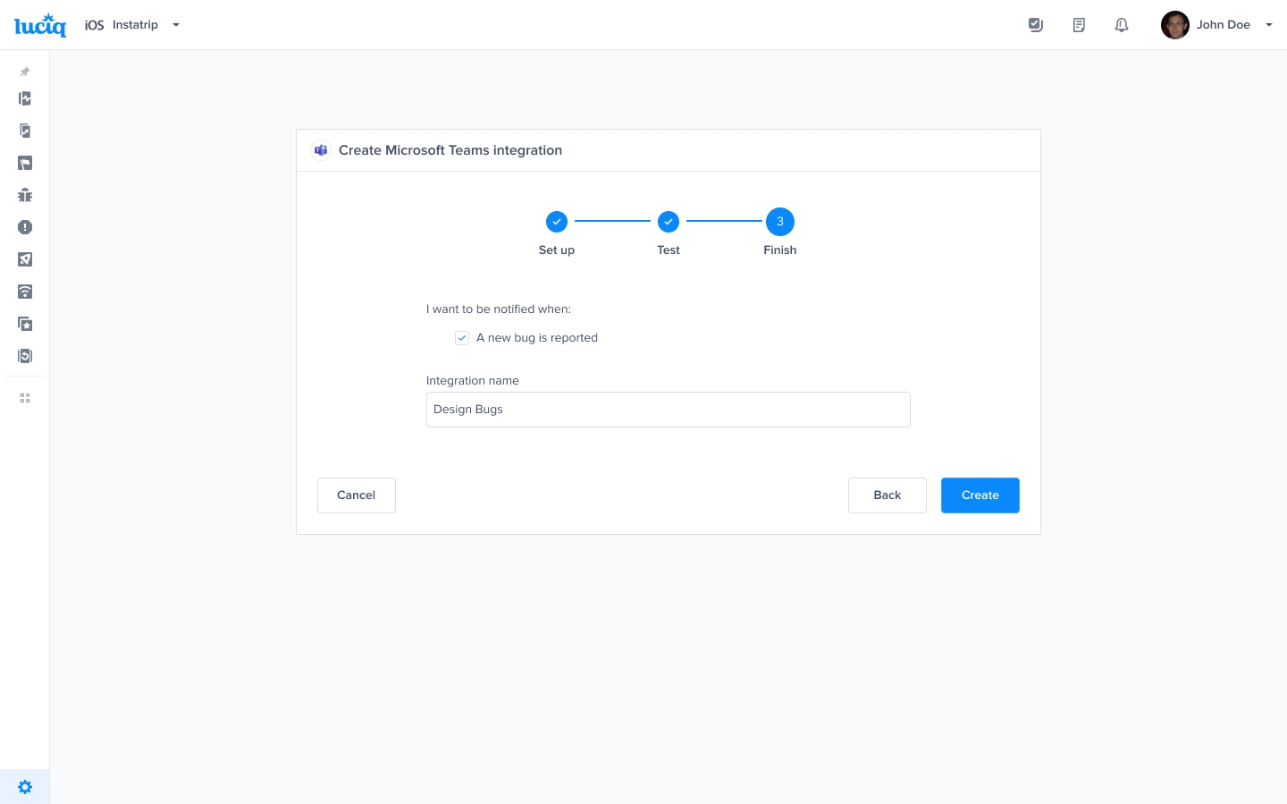 In the final step, you need to choose a name for this integration and whether you want to be notified of every new bug. You can also configure a rule to only forward specific bugs to this channel or team, depending on the conditions you set.