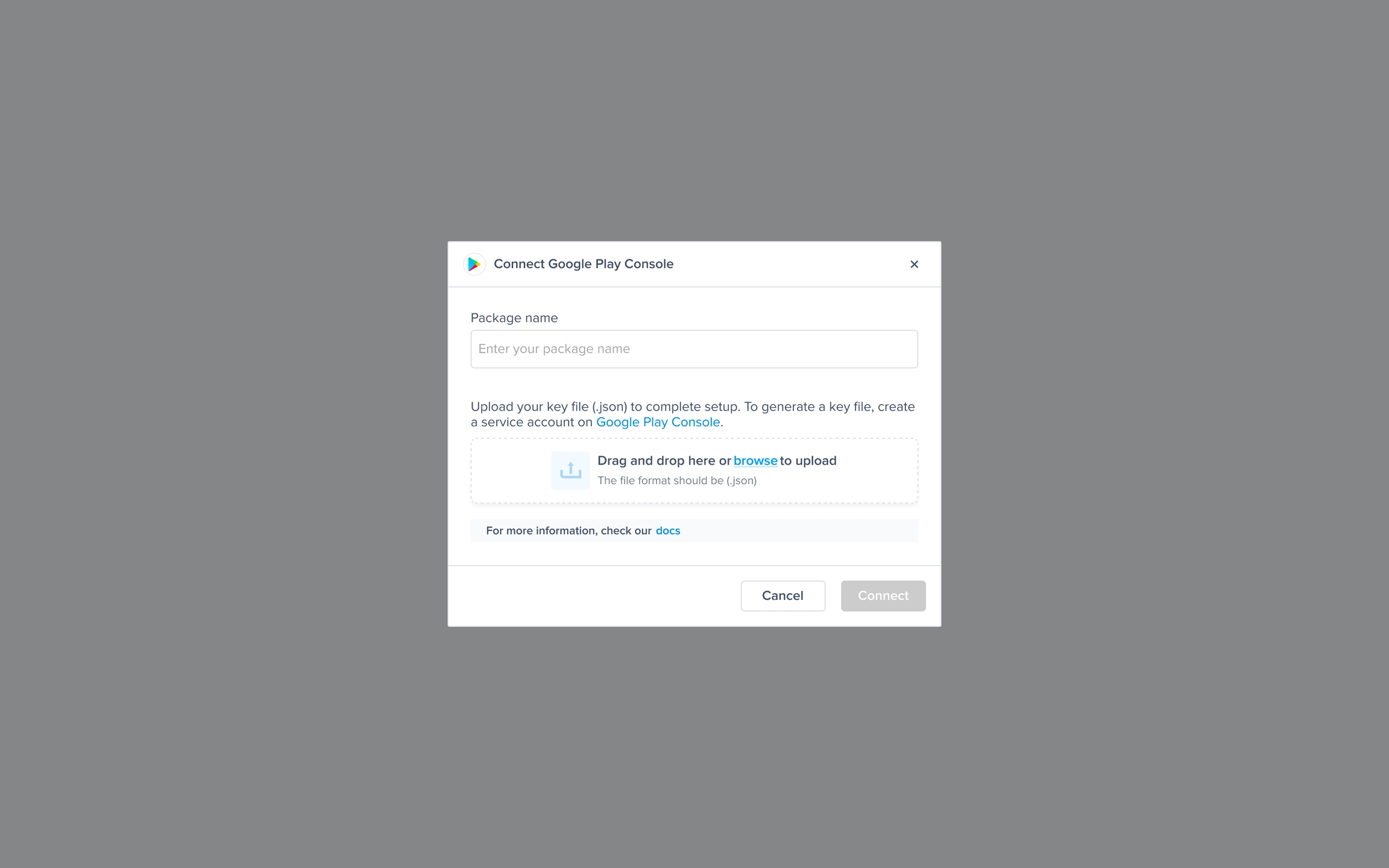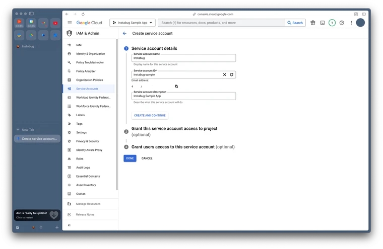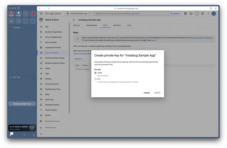Download Service account key file: Your service account key file should start downloading; you’ll need to upload that key on our dashboard.