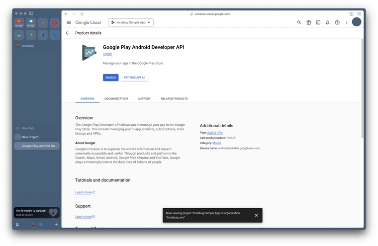 Go to the Google Play Developer API page in Google Cloud Console.