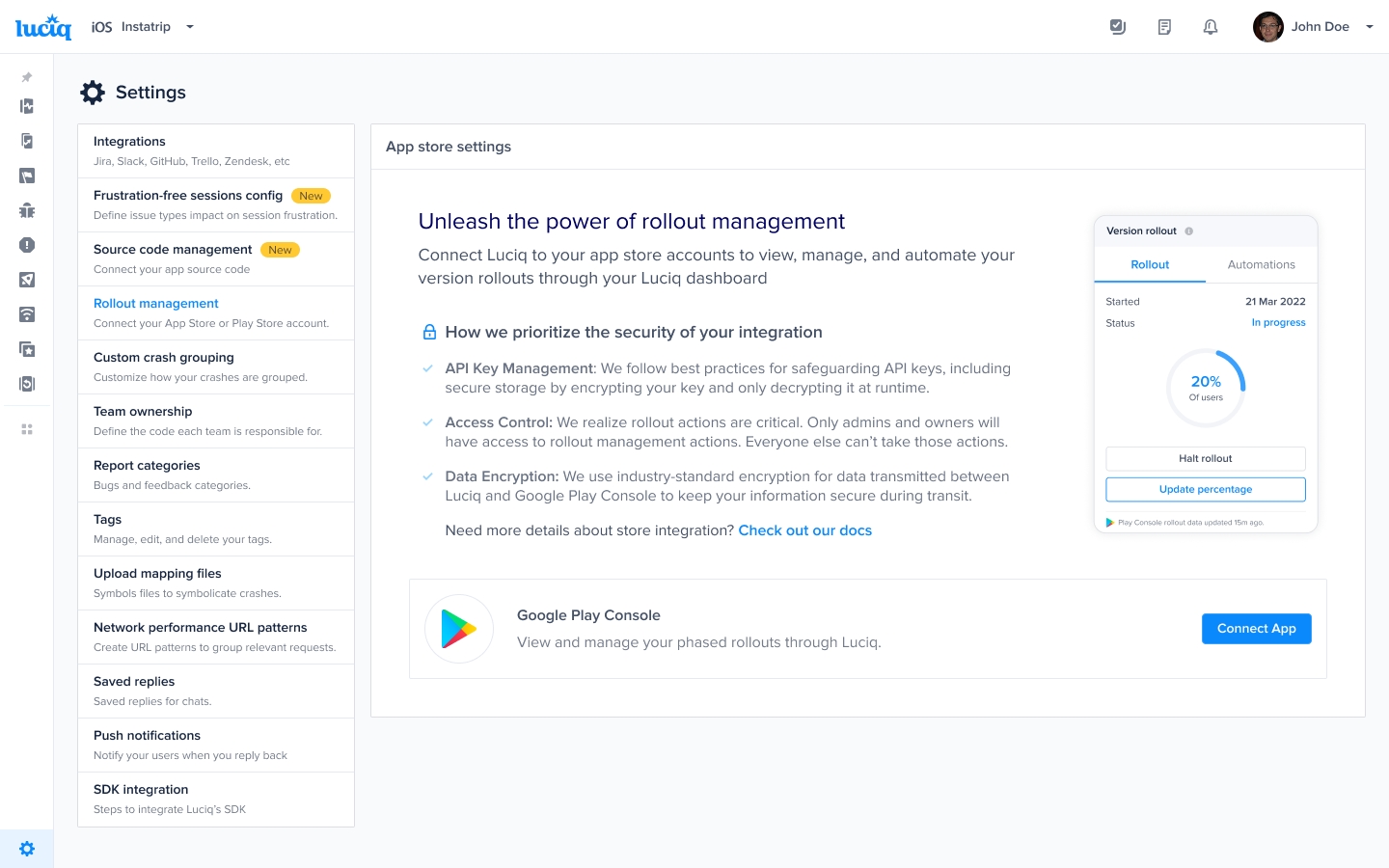 Data Encryption: We use industry-standard encryption for data transmitted between Luciq and the Play Store Console to keep your information secure during transit.