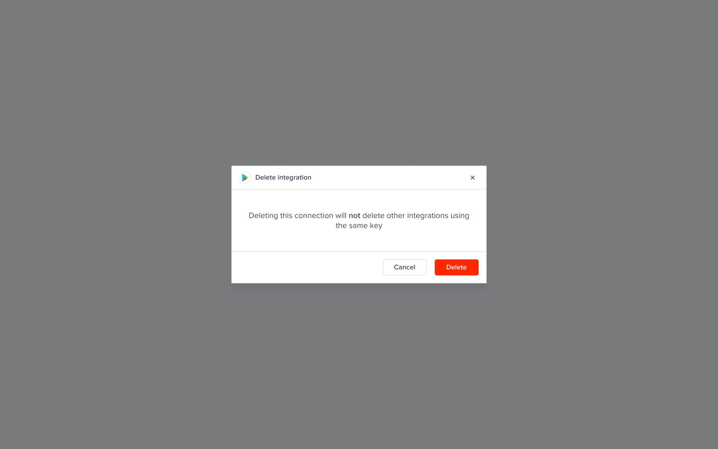 Deleting this integration will not delete the key from the dashboard. The key will be permanently deleted once all integrations using this key are deleted.