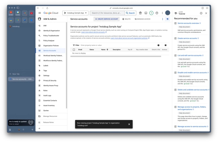 In the Google Cloud Console, go to Service Accounts