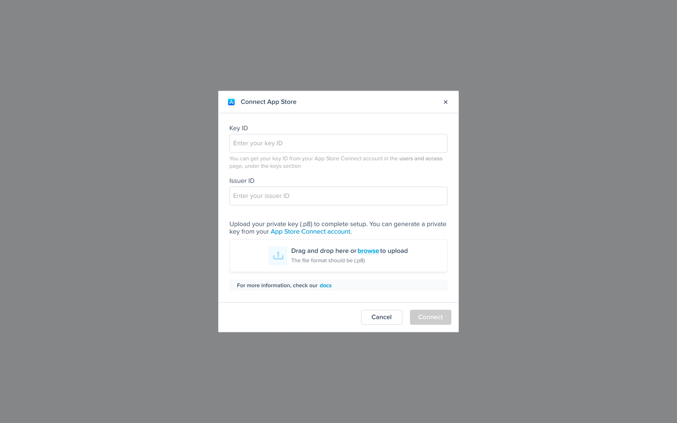 To integrate with the App Store, first generate an API Key with “App Manager“ access. After generating the key, enter your Key ID and Issuer ID, then upload your .p8 file.