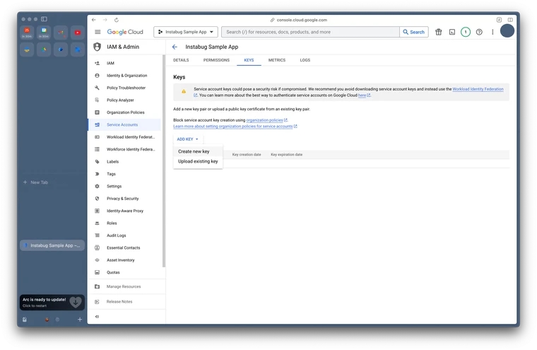 Create a new key: After you've granted permissions, click on the service account name and then select the "Keys" tab. Click the "Create new key" button.