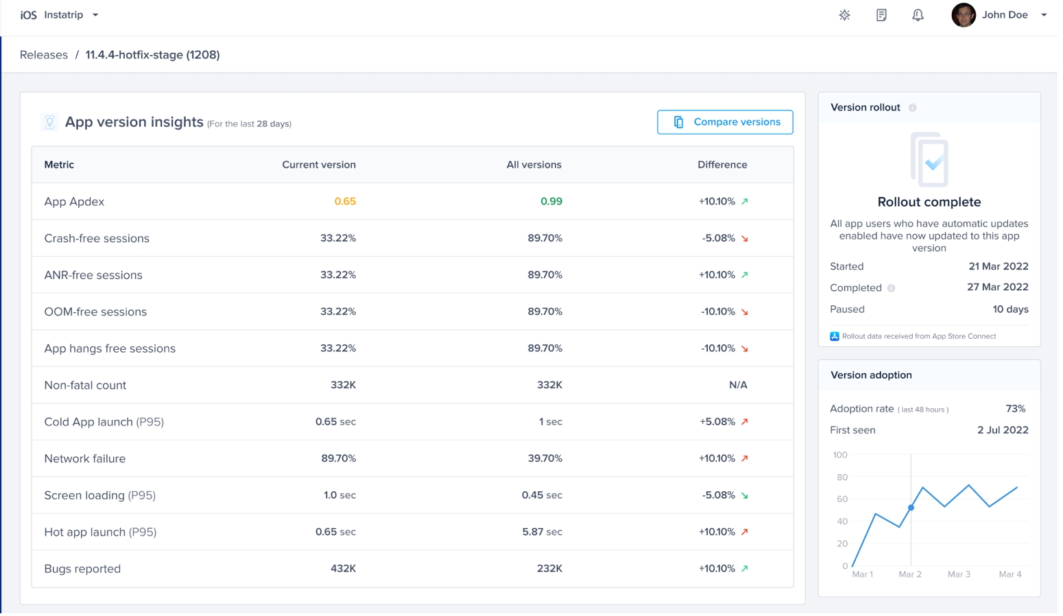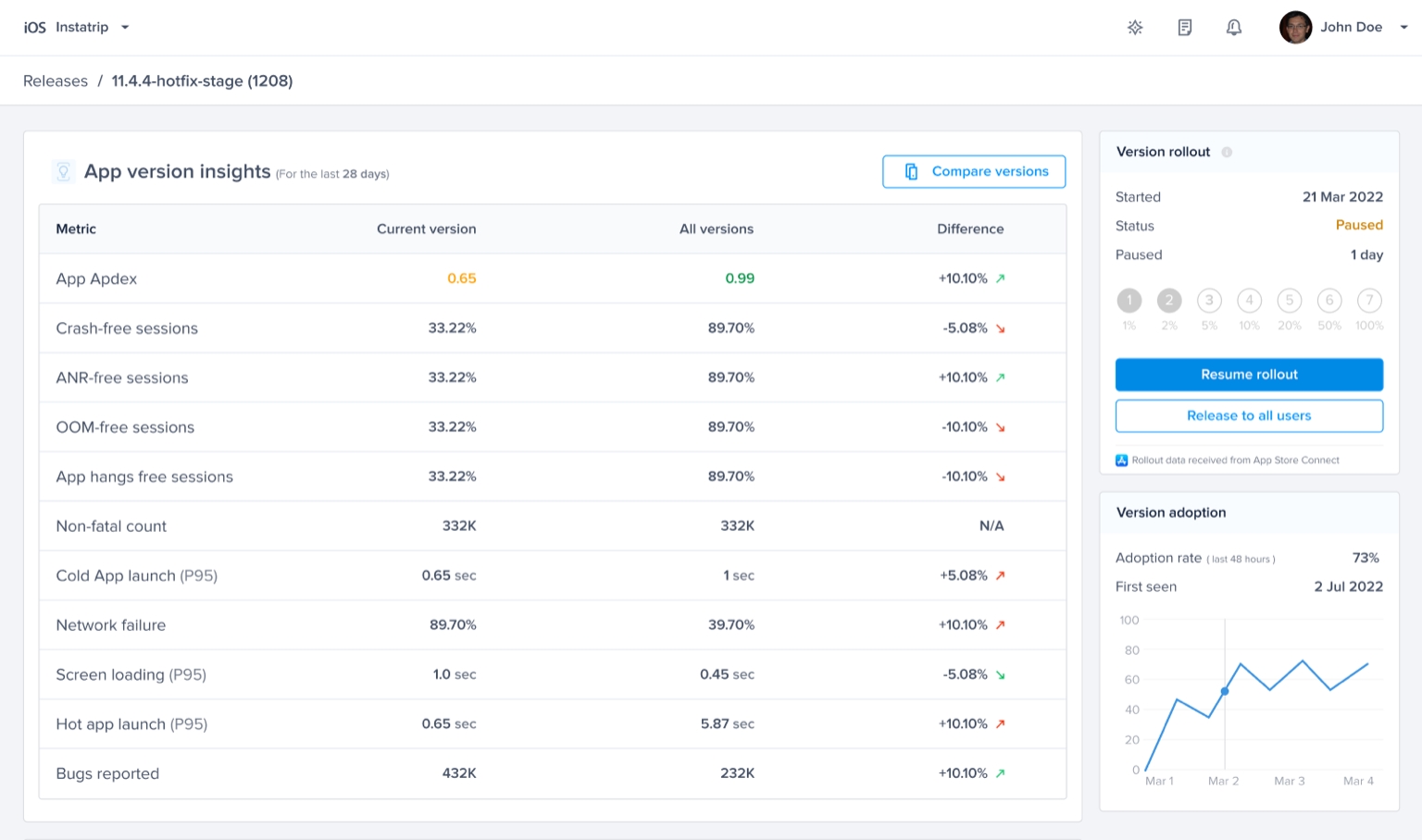 With the App Store integrated with the dashboard, you can view the In-Progress/Paused releases highlighted with progress percentage on your Releases page.