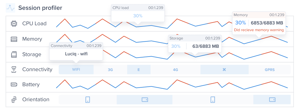 With each report, you'll receive a detailed environment profile covering the last 60 seconds before a bug or feedback was submitted. This Session Profiler includes device data like memory load and battery state. This is enabled by default depending on your plan. More details about the information contained in the Session Profiler can be found here.