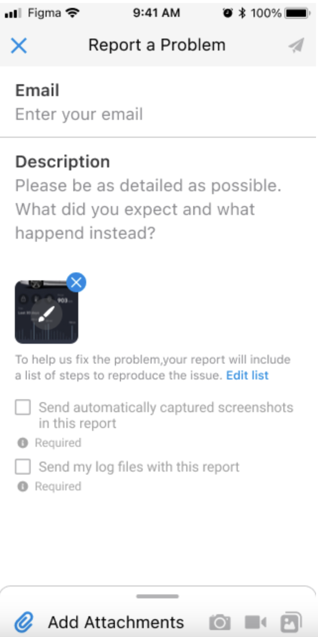 You can also automatically capture a screen recording of your app up to the last 30 seconds before a report is sent. By default, this is disabled. Your users will also be prompted once the recording starts at the beginning of the session and will have the ability to remove the video from the attachments when sending the report. The auto screen recording attachment counts towards the limit of 4 attachments in total.
